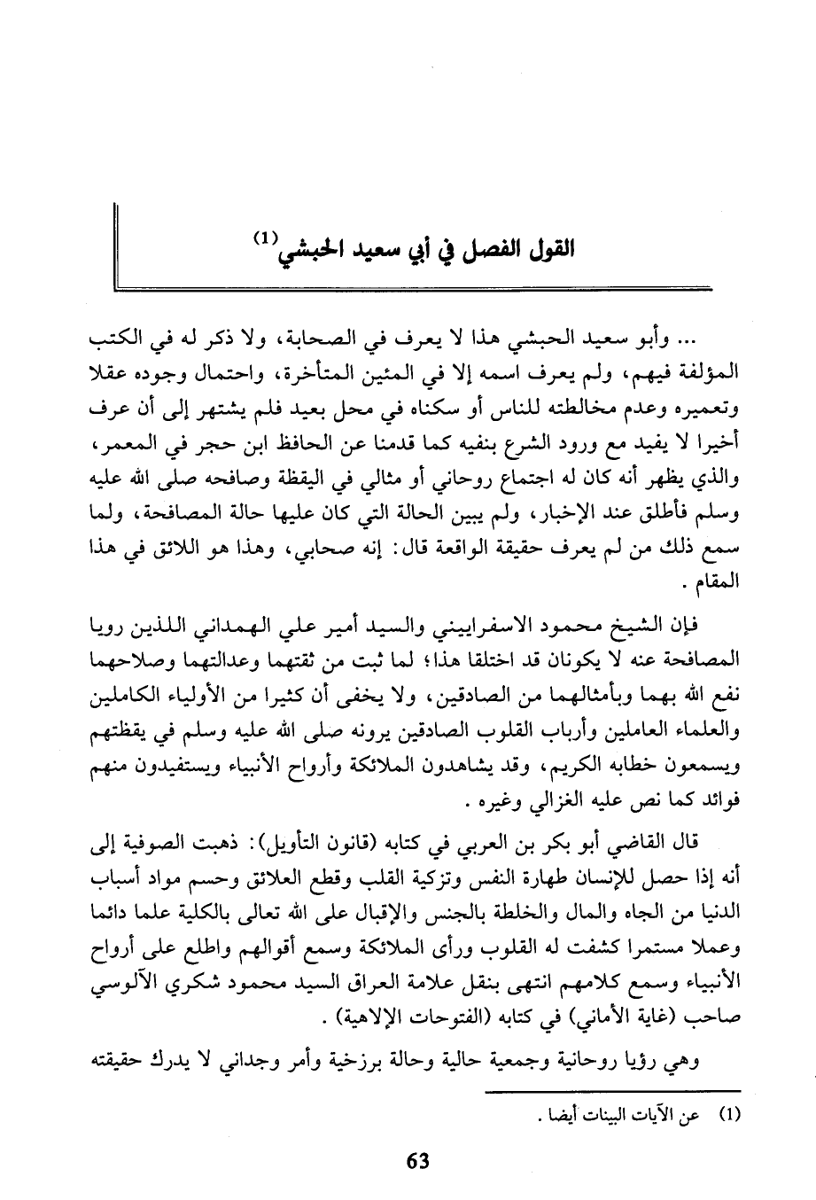 القول الفصل في أَبِي سعيد الحبشي وأَبُو سعيد الحبشي هَذَا لا يعرف في الصحابة، ولا ذكر له في الكتب المؤلفة فيهم، ولم يعرف اسمه إلا في المئين المتأخرة، واحتمال وجوده عقلا وتعميره وعدم مخالطته للناس أو سكناه في محل بعيد فلم يشتهر إلى أن عرف أخيرا لا يفيد مع ورود الشرع بْنفيه كما قدمنا عن الْحَافِظ ابْن حجر في العمر، والذي يظهر أنه كان له اجتماع روحاني أو مثالي في اليقظة وصافحه صَلَّى اللَّهُ عَلَيْهِ وَسَلَّمَ فأطلق عند الإخبار، ولم يبين الحالة التي كان عليها حالة المصافحة، ولما سمع ذلك من لم يعرف حقيقة الواقعة، قَالَ: إنه صحابي.