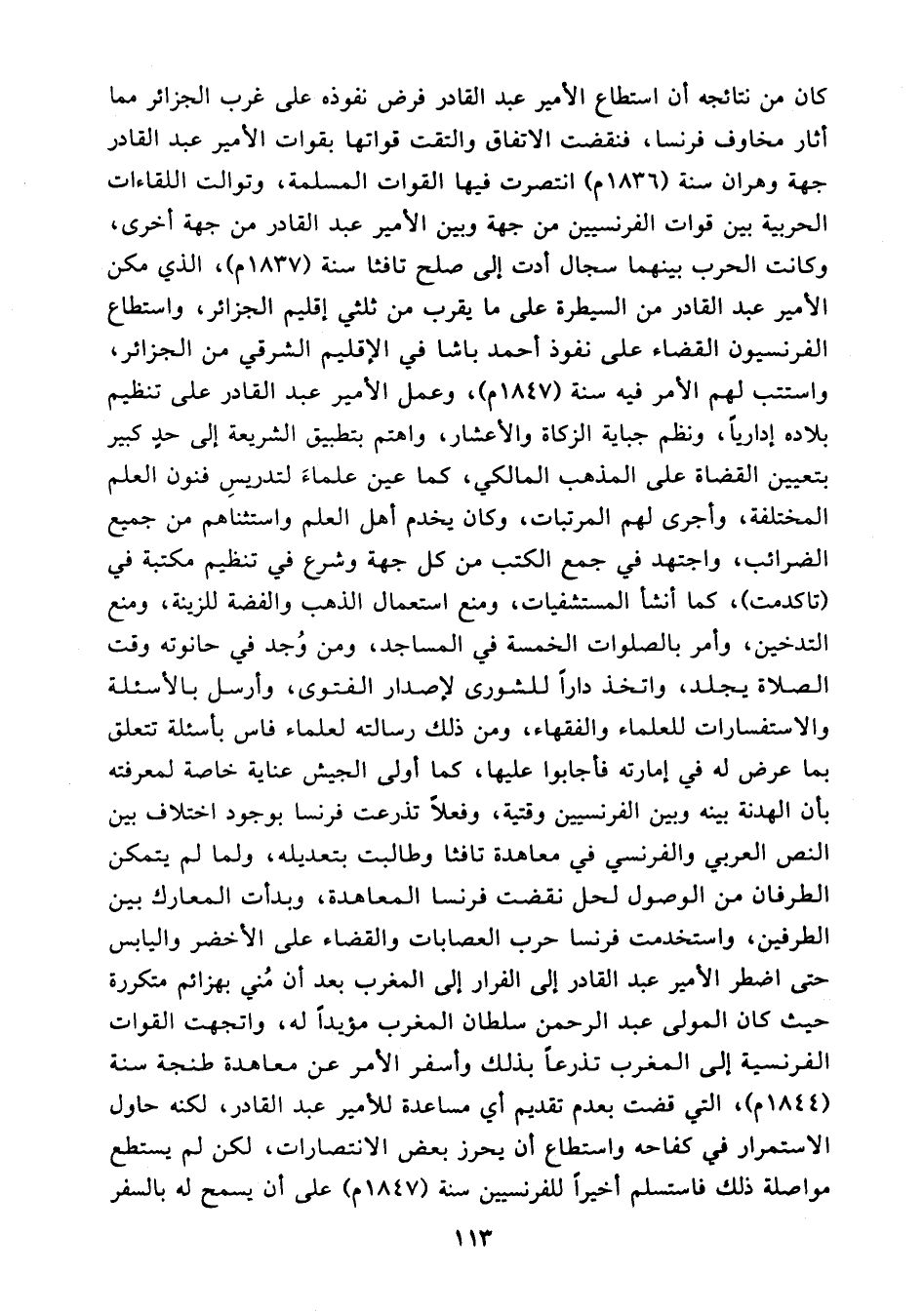 ولما لم يتمكن الطرفان من الوصول لحل نقضت فرنسا المعاهدة، وبدأت المعارك بين الطرفين واستخدمت فرنسا حرب العصابات والقضاء على الأخضر واليابس حتى اضطر الأمير عبد القادر إلى الفرار إلى المغرب بعد أن مني بهزائم متكررة حيث كان المولى عبدالرحمن سلطان المغرب مؤيدا له، واتجهت القوات الفرنسية إلى المغرب تذرعا بذلك وأسفر الأمر عن معاهدة طنجة سنة 1844 م، التي قضت بعدم تقديم أي مساعدة للأمير عبد القادر لكنه حاول الاستمرار في كفاحه واستطاع أن يحرز بعض الانتصارات لكن لم يستطع مواصلة ذلك فاستسلم أخيرا للفرنسيين سنة 1847 م على أن يسمح له بالسفر