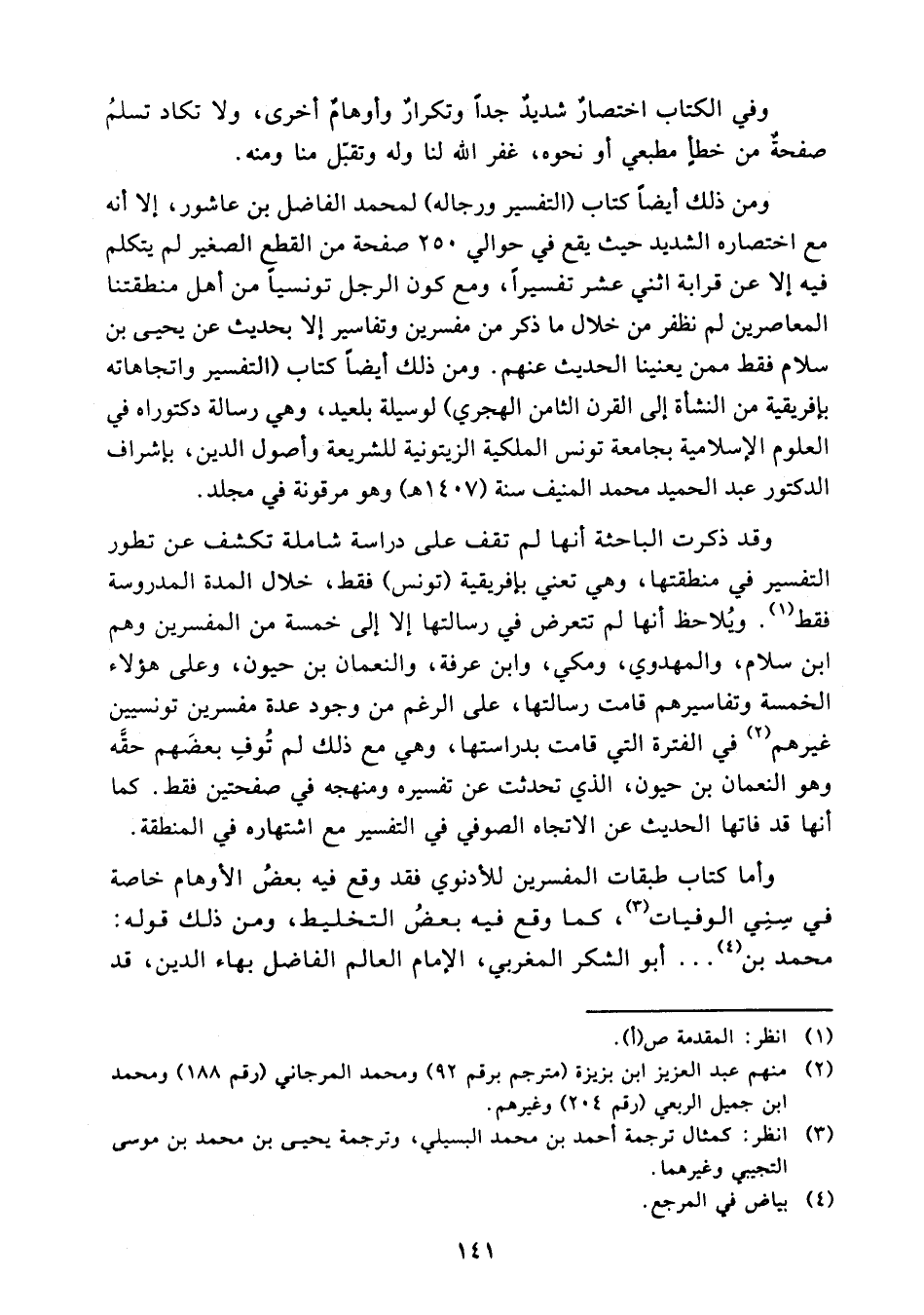 ومن ذلك أيضا كتاب التفسير ورجاله لمحمد الفاضل بن عاشور إلا أنه مع اختصاره الشديد حيث يقع في حوالي 250 صفحة من القطع الصغير لم يتكلم فيه إلا عن قرابة اثني عشر تفسيرا، ومع كون الرجل تونسيا من أهل منطقتنا المعاصرين لم نظفر من خلال ماذكر من مفسرين وتفاسير إلا بحديث عن يحيى بن سلام فقط ممن يعنينا الحديث عنهم.