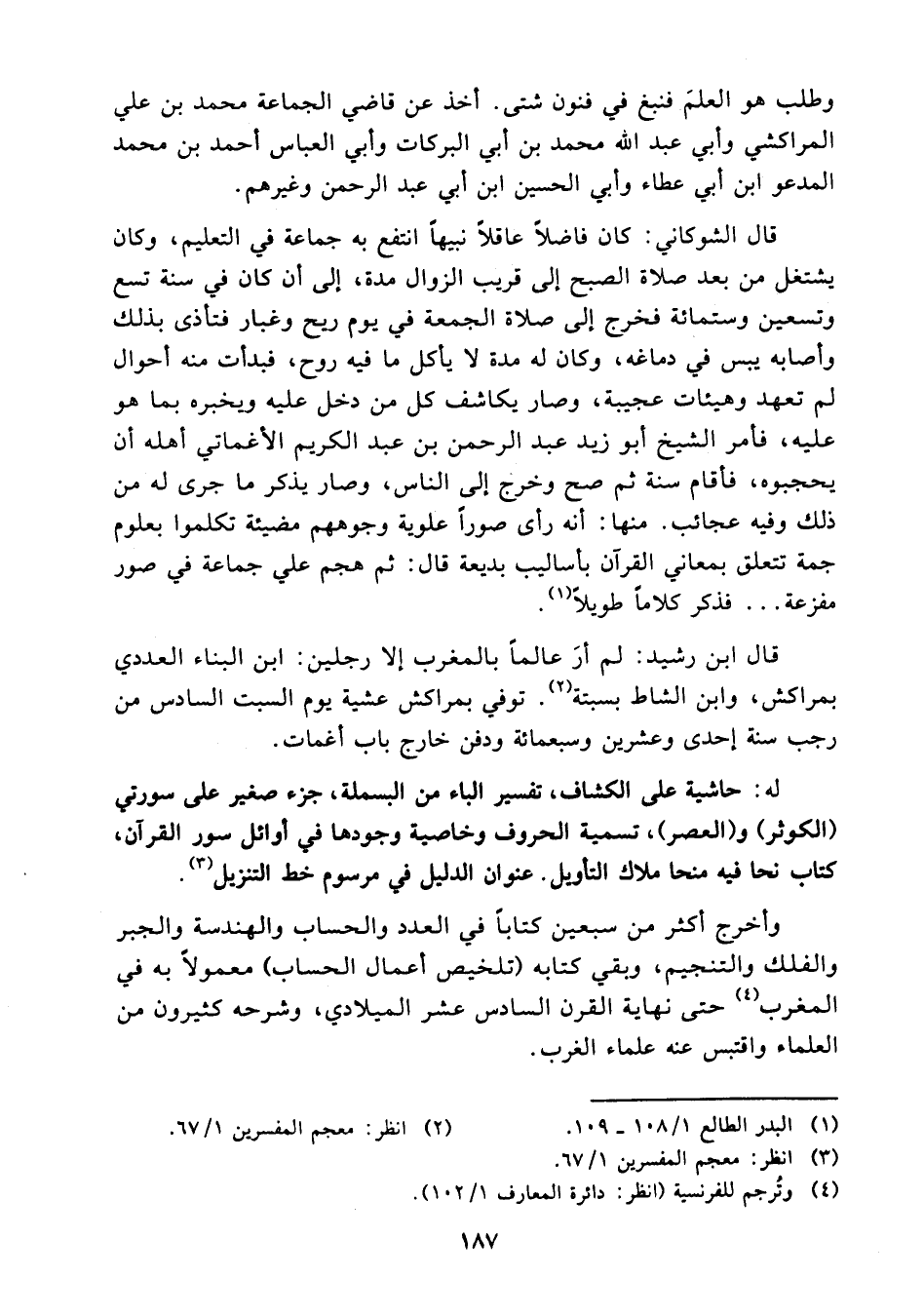 وأخرج أكثر من سبعين كتابا في العدد والحساب والهندسة والجبر والفلك والتنجيم وبقي كتابه (تلخيص أعمال الحساب) معمولا به في المغرب (¬4) حتى نهاية القرن السادس عشر الميلادي وشرحه كثيرون من العلماء واقتبس عنه علماء الغرب.