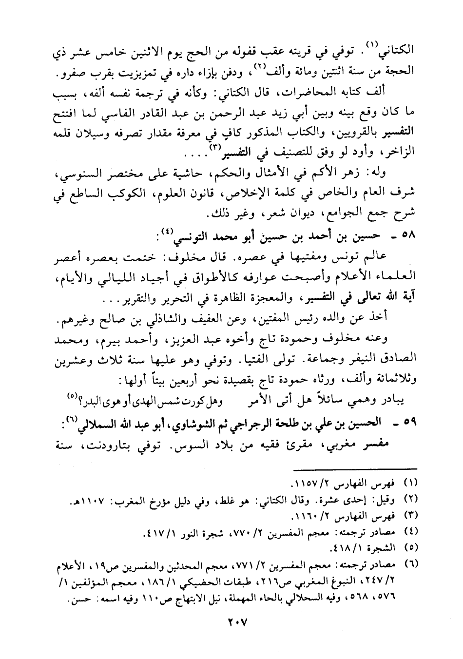 (¬6) مصادر ترجمته: معجم المفسرين 2/ 771، معجم المحدثين والمفسرين 19، الأعلام 2/ 247، النبوغ المغربي 216، طبقات الحضيكي 1/ 186، معجم المؤلفين 1/ 568، 576 وفيه السحلالي بالحاء المهملة، نيل الابتهاج 110 وفيه اسمه: حسن.