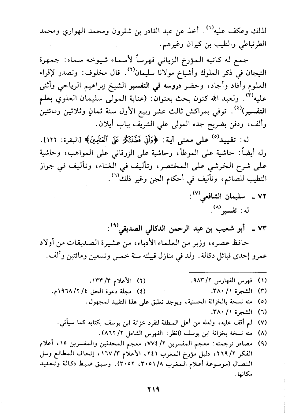 (¬10) مصادر ترجمته: معجم المفسرين 2/ 774، معجم المحدثين والمفسرين 15، أعلام الفكر 2/ 269، دليل مؤرخ المغرب 241، الأعلام 3/ 167، إتحاف المطالع وسل النصال (موسوعة أعلام المغرب 8/ 3051، 3052) وسبق ضبط دكالة وتحديد مكانها.