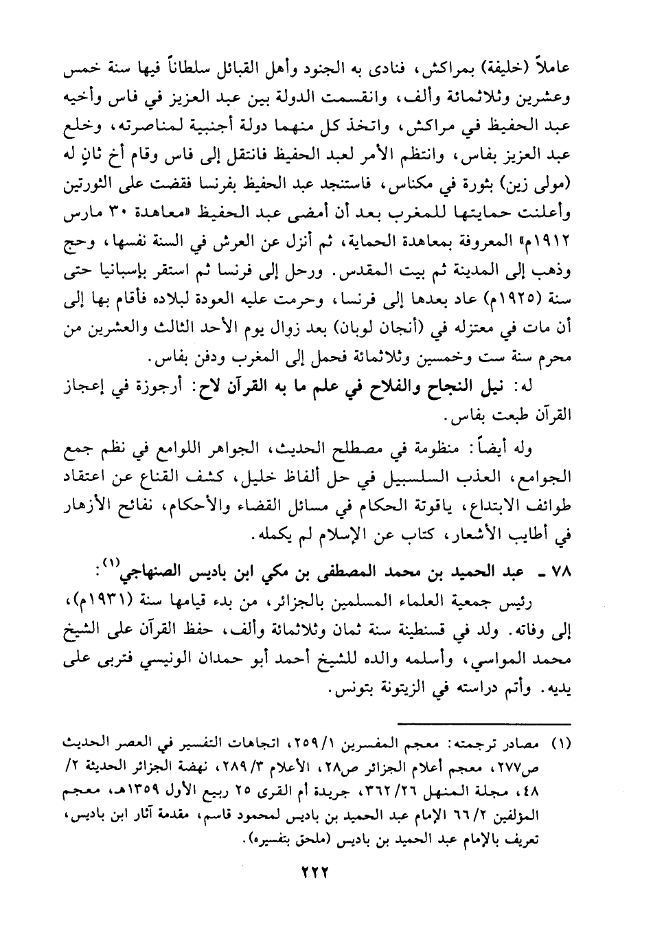 (¬1) مصادر ترجمته: معجم المفسرين 1/ 259، إتجاهات التفسير في العصر الحديث 277، معجم أعلام الجزائر 28، الأعلام 3/ 289، نهضة الجزائر الحديثة 2/ 48، مجلة المنهل 26/ 362، جريدة أم القرى 25 ربيع الأول 1359 هـ، معجم المؤلفين 2/ 66، الإمام عبد الحميد بن باديس لمحمود قاسم، مقدمة آثار ابن باديس، تعريف بالإمام عبد الحميد بن باديس (ملحق بتفسيره).