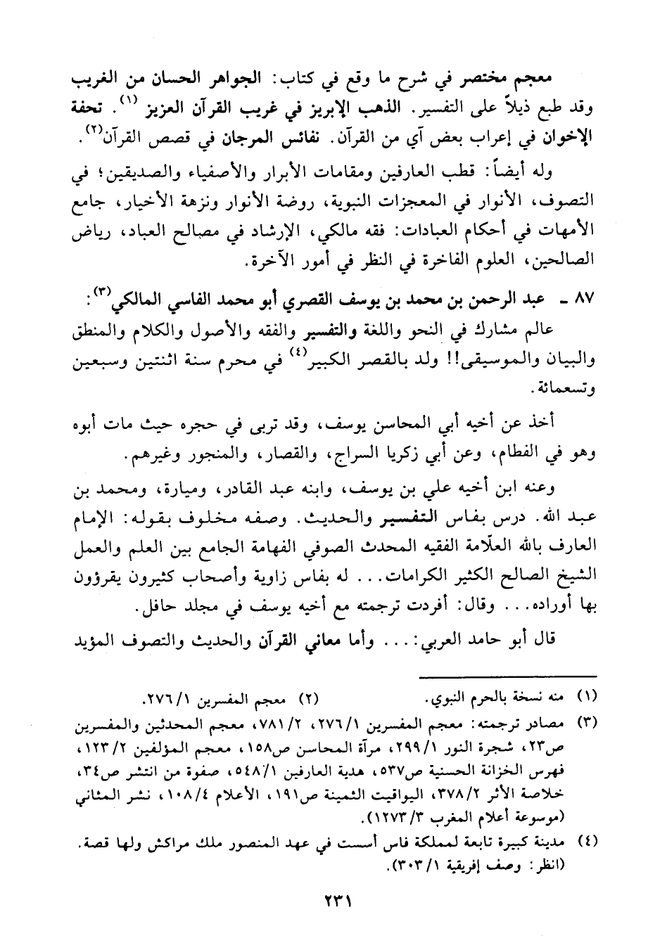 (¬3) مصادر ترجمته: معجم المفسرين 1/ 276، 2/ 781، معجم المحدثين والمفسرين 23، شجرة النور 1/ 299، مرآة المحاسن 158، معجم المؤلفين 2/ 123، فهرس الخزانة الحسنية 537، هدية العارفين 1/ 548، صفوة من انتشر 34، خلاصة الأثر 2/ 378، اليواقيت الثمينة 191، الأعلام 4/ 108، نشر المثاني (موسوعة أعلام المغرب 3/ 1273).