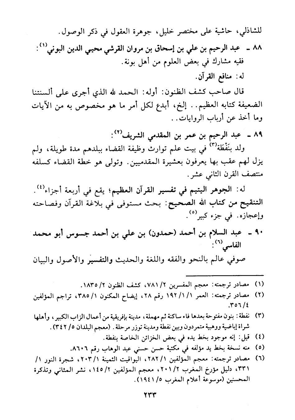 (¬6) مصادر ترجمته: معجم المفسرين 1/ 282، اليواقيت الثمينة 1/ 203، شجرة النور 1/ 331، دليل مؤرخ المغرب 2/ 201، معجم المؤلفين 2/ 145، نشر المثاني وتذكرة المحسنين (موسوعة أعلام المغرب 5/ 1941).