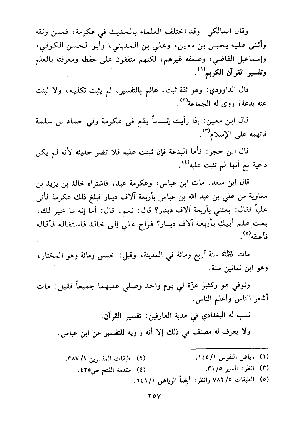 وقال المالكي: وقد اختلف العلماء بالحديث في عكرمة فممن وثقه وأثنى عليه يحيى ابن معين وعلي بن المديني وأبو الحسن الكوفي وإسماعيل القاضي وضعفه غيرهم، لكنهم متفقون على حفظه ومعرفته بالعلم وتفسير القرآن الكريم. (¬1)