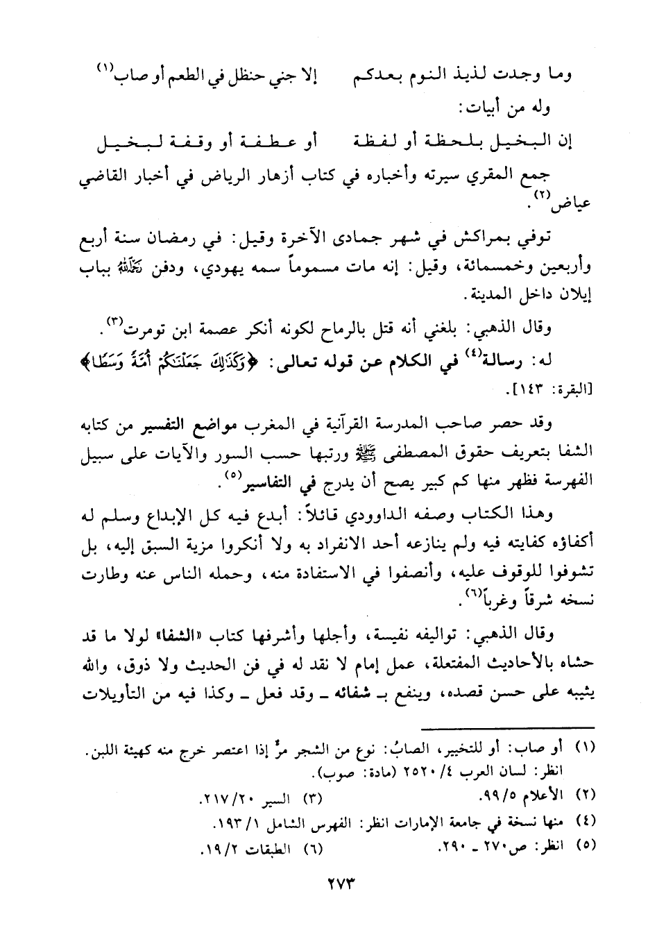 وهذا الكتاب وصفه الداوودي قائلا: أبدع فيه كل الإبداع وسلم له أكفاؤه كفايته فيه ولم ينازعه أحد الانفراد به ولا أنكروا مزية السبق إليه بل تشوفوا للوقوف عليه وأنصفوا في الاستفادة منه وحمله الناس عنه وطارت نسخه شرقا وغربا. (¬7)