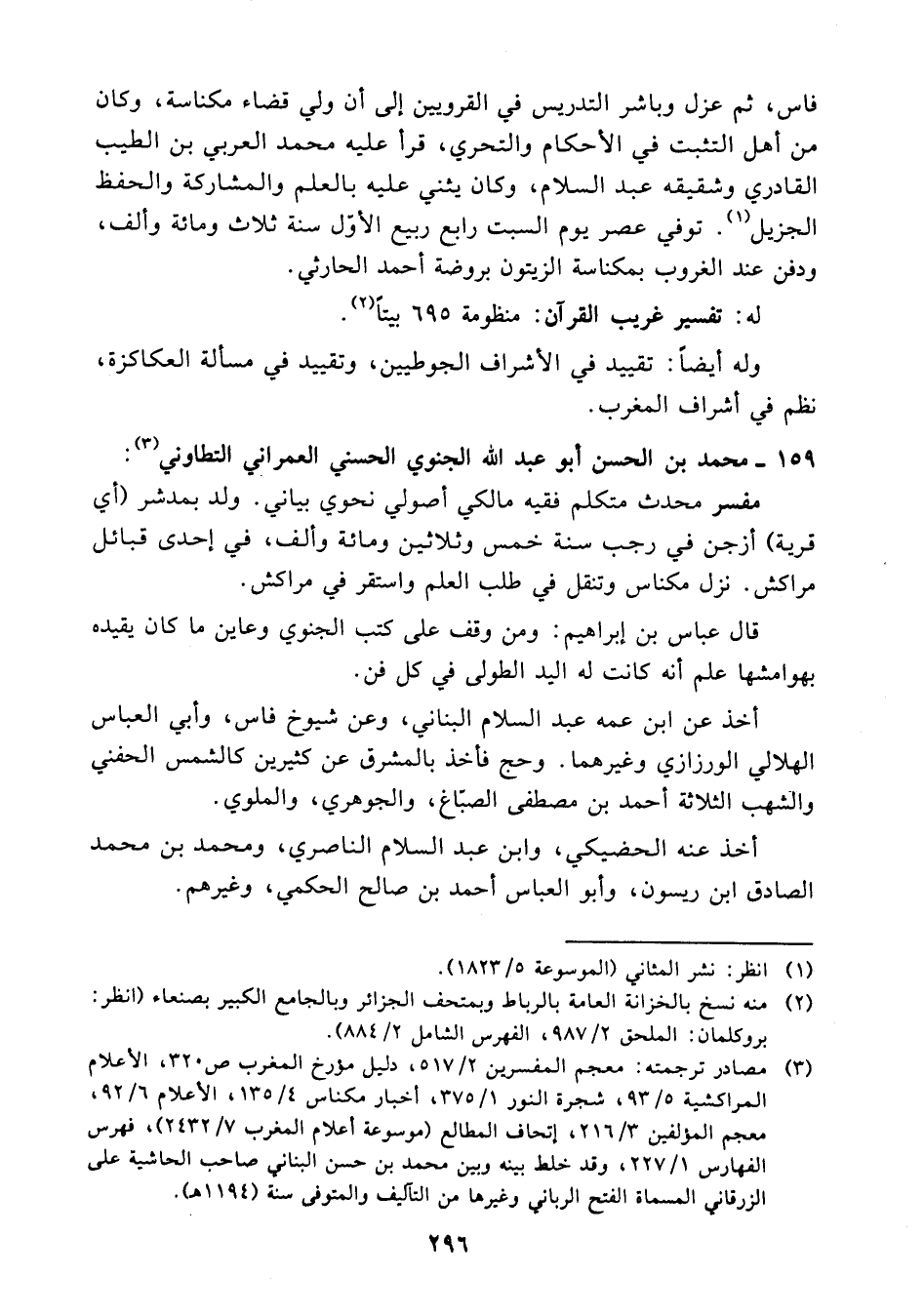 (¬3) مصادر ترجمته: معجم المفسرين 2/ 517، دليل مؤرخ المغرب 320، الأعلام المراكشية 5/ 93، شجرة النور 1/ 375، أخبار مكناس 4/ 135، الأعلام 6/ 92، معجم المؤلفين 3/ 216، إتحاف المطالع (موسوعة أعلام المغرب 7/ 2432)، فهرس الفهارس 1/ 227 وقد خلط بينه وبين محمد بن حسن البناني صاحب الحاشية على الزرقاني المسماة الفتح الرباني وغيرها من التآليف والمتوفى سنة 1194 هـ.