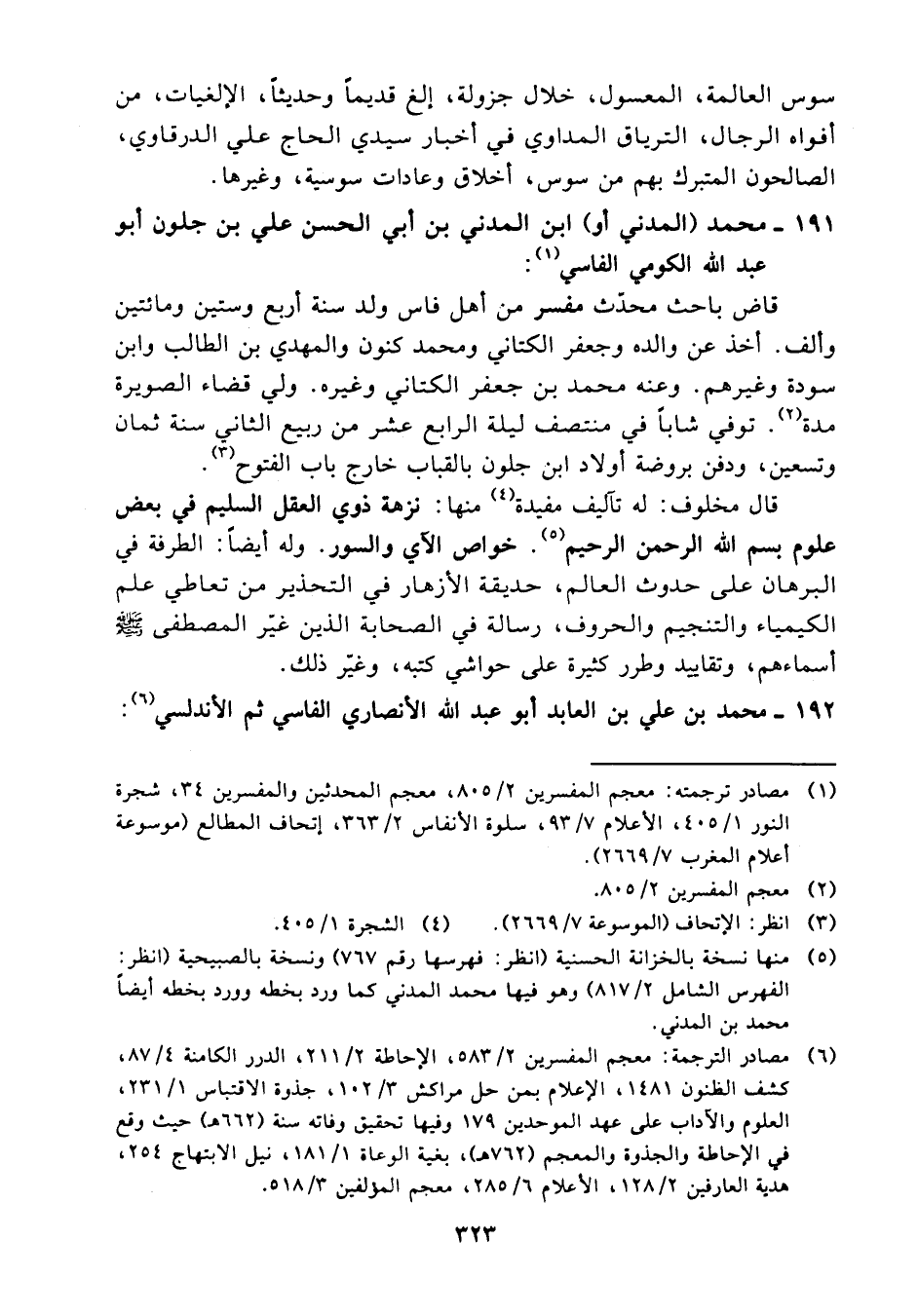 (¬1) مصادر ترجمته: معجم المفسرين 2/ 805، معجم المحدثين والمفسرين 34، شجرة النور 1/ 405، الأعلام 7/ 93، سلوة الأنفاس 2/ 363، إتحاف المطالع (موسوعة أعلام المغرب 7/ 2669).