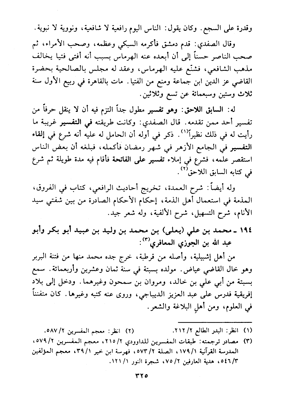 قال الصفدي: وكانت طريقته في التفسير غريبة مارأيت له في ذلك نظيرا. (¬1)
