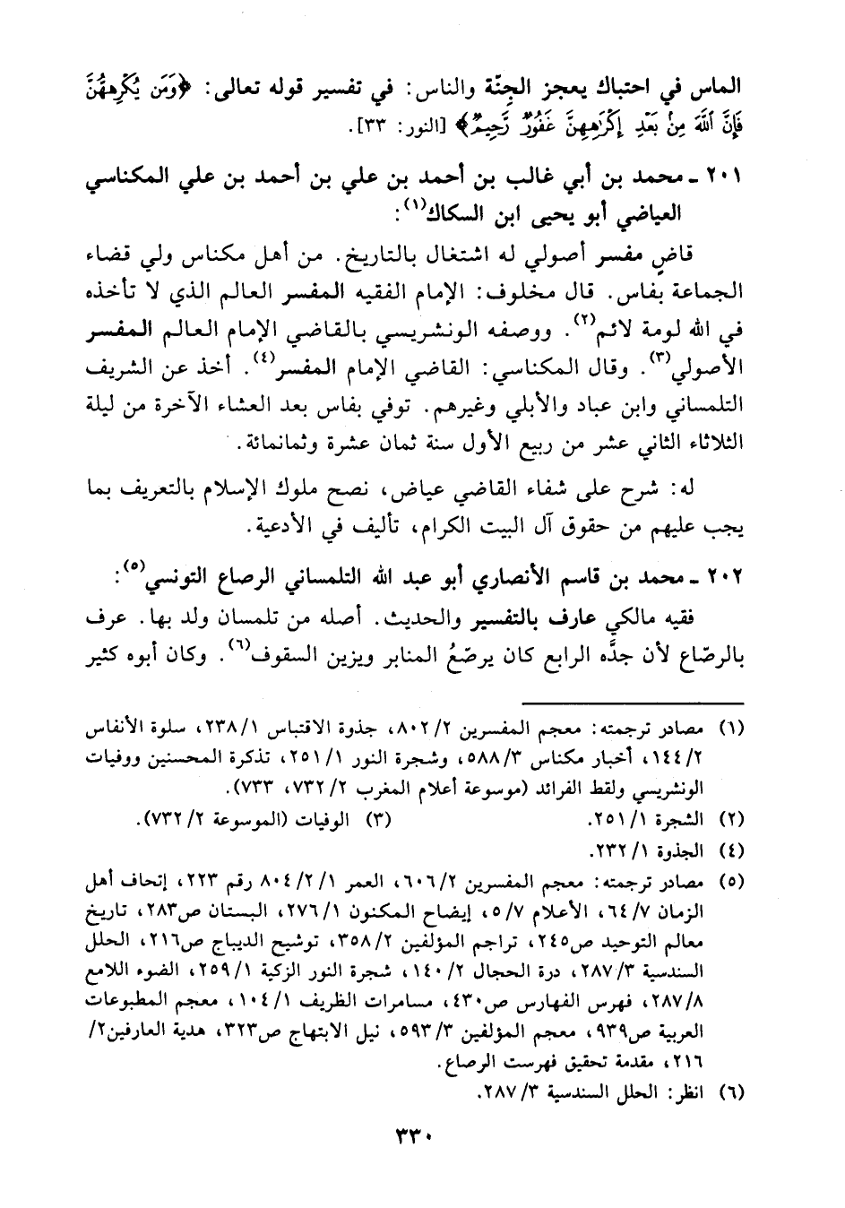 (¬6) مصادر ترجمته: معجم المفسرين 2/ 606، العمر 1/ 2 / 804 رقم 223، إتحاف أهل الزمان 7/ 64، الأعلام 7/ 5، إيضاح المكنون 1/ 276، البستان ص: 283، تاريخ معالم التوحيد ص: 245، تراجم المؤلفين 2/ 358، توشيح الديباج ص: 216، الحلل السندسية 3/ 287، درة الحجال 2/ 140، شجرة النور الزكية 1/ 259، الضوء اللامع 8/ 287، فهرس الفهارس ص: 430، مسامرات الظريف 1/ 104، معجم المطبوعات العربية ص: 939، معجم المؤلفين 3/ 593، نيل الابتهاج 323، هدية العارفين2/ 216، مقدمة تحقيق فهرست الرصاع.