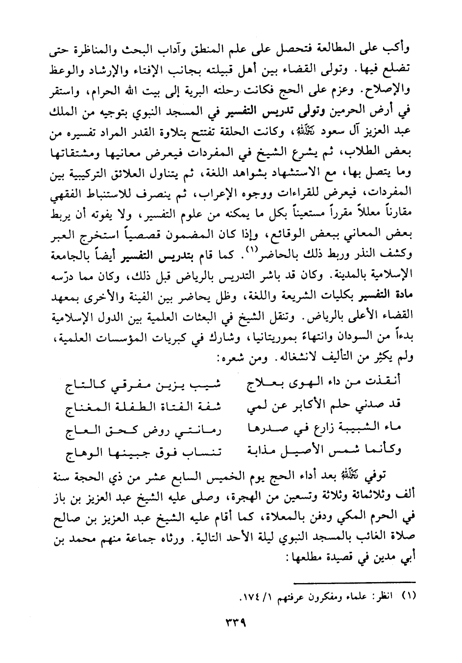 وعزم على الحج فكانت رحلته البرية إلى بيت الله الحرام، واستقر في أرض الحرمين وتولى تدريس التفسير في المسجد النبوي بتوجيه من الملك عبد العزيز آل سعود رحمه الله وكانت الحلقة تفتتح بتلاوة القدر المراد تفسيره من بعض الطلاب ثم يشرع الشيخ في المفردات فيعرض معانيها ومشتقاتها ومايتصل بها مع الاستشهاد بشواهد اللغة ثم يتناول العلائق التركيبية بين المفردات فيعرض للقراءات ووجوه الإعراب ثم ينصرف للاستنباط الفقهي مقارنا معللا مقررا مستعينا بكل مايمكنه من علوم التفسير ولايفوته أن يربط بعض المعاني ببعض الوقائع وإذا كان المضمون قصصيا استخرج العبر وكشف النذر وربط ذلك بالحاضر (¬1).