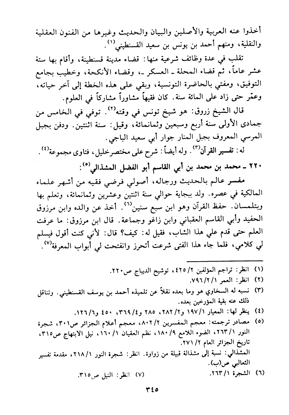 (¬5) مصادر ترجمته: معجم المفسرين 2/ 802، معجم أعلام الجزائر 301، شجرة النور 1/ 263، الضوء اللامع 9/ 180، نظم العقيان 1/ 160، نيل الابتهاج 315، تاريخ الجزائر العام 2/ 271.