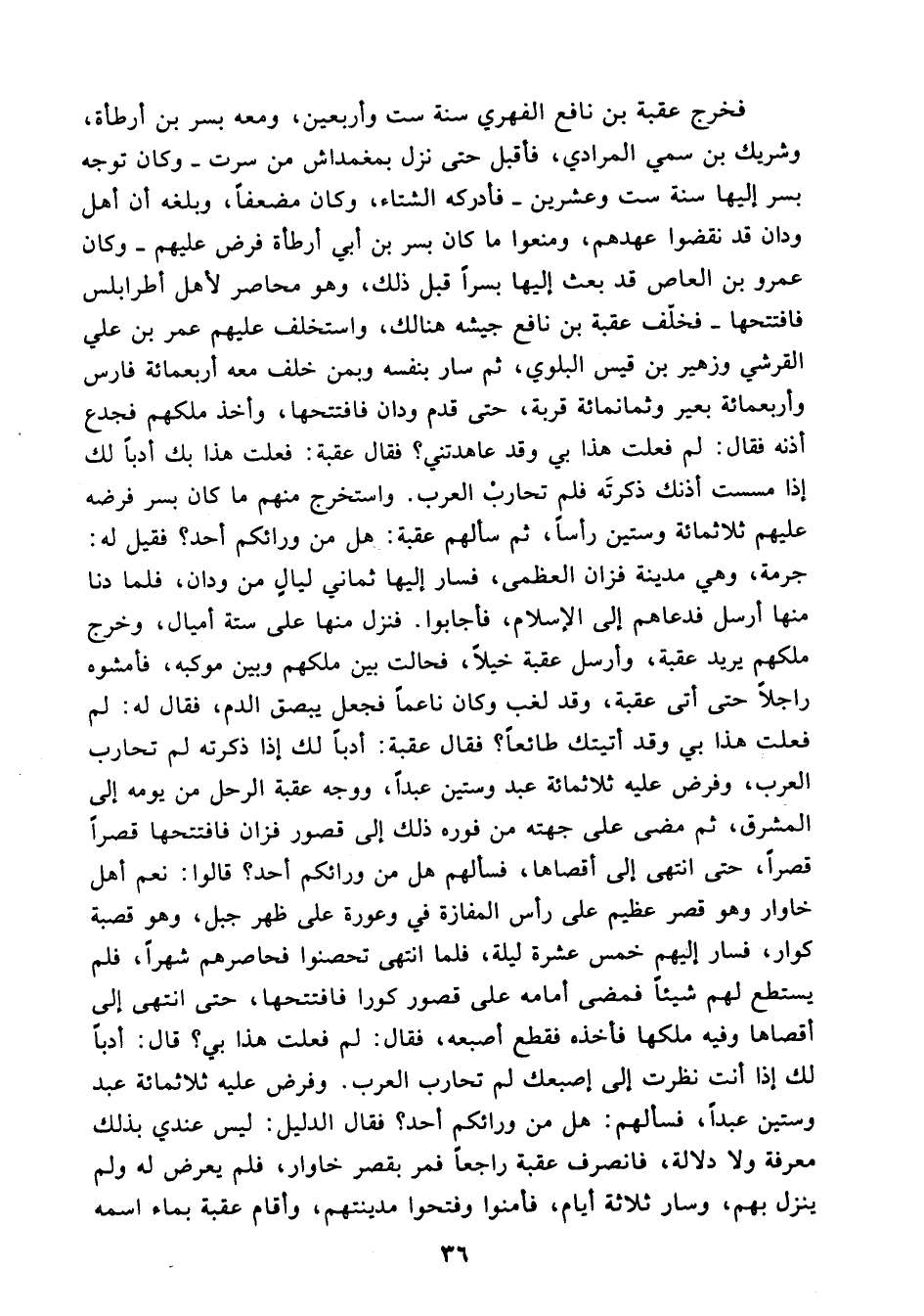 فنزل منها على ستة أميال، وخرج ملكهم يريد عقبة، وأرسل عقبة خيلا، فحالت بين ملكهم وبين موكبه، فأمشوه راجلا حتى أتى عقبة، وقد لغب وكان ناعما فجعل يبصق الدم فقال له: لم فعلت هذا بي وقد أتيتك طائعا؟ فقال عقبة أدبا لك إذا ذكرته لم تحارب العرب، وفرض عليه ثلاثمائة عبد وستين عبدا، ووجه عقبة الرحل من يومه إلى المشرق، ثم مضى على جهته من فوره ذلك إلى قصور فزان فافتتحها قصرا قصرا، حتى انتهى إلى أقصاها، فسألهم هل من ورائكم أحد؟ قالوا نعم: أهل خاوار وهو قصر عظيم على رأس المفازة في وعورة على ظهر جبل، وهو قصبة كوار فسار إليهم خمسة عشر ليلة، فلما انتهى تحصنوا فحاصرهم شهرا، فلم يستطع لهم شيئا فمضى أمامه على قصوركورا فافتتحها، حتى انتهى إلى أقصاها وفيه ملكها فأخذه فقطع أصبعه، فقال: لم فعلت هذا بي؟ قال: أدبا لك إذا أنت نظرت إلى اصبعك لم تحارب العرب، وفرض عليه ثلاثمائة عبد وستين عبدا، فسألهم: هل من ورائكم أحد؟ فقال الدليل: ليس عندي بذلك معرفة ولادلالة، فانصرف عقبة راجعا.