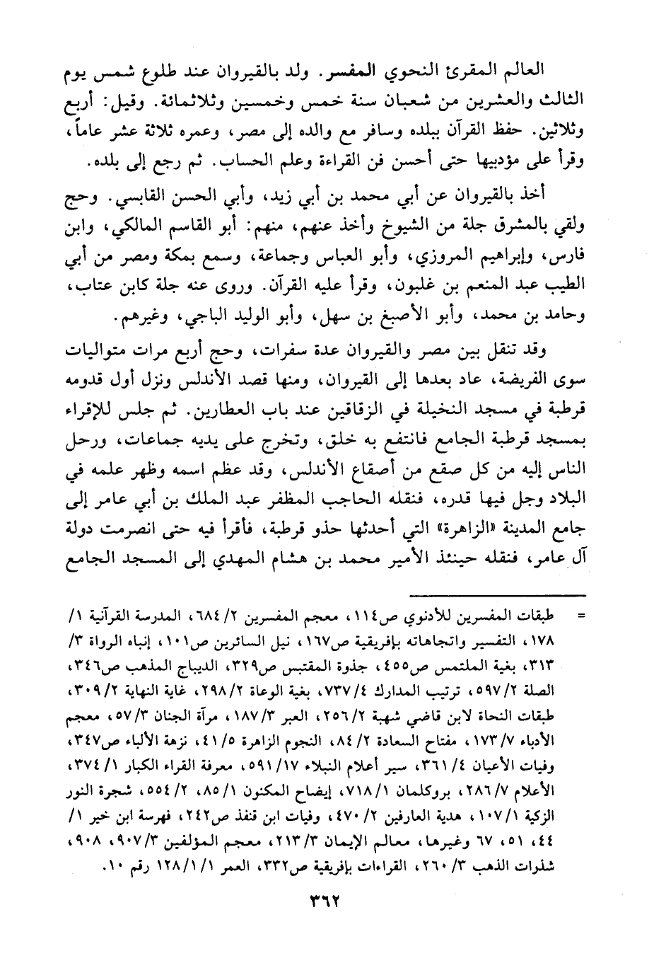 وقد تنقل بين مصر والقيروان عدة سفرات وحج أربع مرات متواليات سوى الفريضة، عاد بعدها إلى القيروان ومنها قصد الأندلس ونزل أول قدومه قرطبة في مسجد النخيلة في الزقاقين عند باب العطارين. ثم جلس للإقراء بمسجد قرطبة الجامع فانتفع به خلق، وتخرج على يديه جماعات، ورحل الناس إليه من كل صقع من أصقاع الأندلس، وقد عظم اسمه وظهر علمه في البلاد وجل فيها قدره، فنقله الحاجب المظفر عبد الملك بن أبي عامر إلى جامع المدينة "الزاهرة" التي أحدثها حذو قرطبة فأقرأ فيه حتى انصرمت دولة آل عامر، فنقله حينئذ الأمير محمد بن هشام المهدي إلى المسجد الجامع