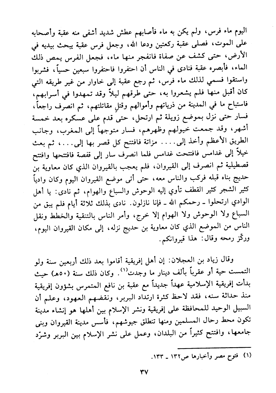 اليوم ماء فرس، ولم يكن به ماء فأصابهم عطش شديد أشفى منه عقبة وأصحابه على الموت، فصلى عقبة ركعتين ودعا الله، وجعل فرس عقبة يبحث بيديه في الأرض، حتى كشف عن صفاة فانفجر منها ماء، فجعل الفرس يمص ذلك الماء، فأبصره عقبة فنادى في الناس أن احتفروا فاحتفروا سبعين حسيا، فشربوا واستقوا فسمي لذلك ماء فرس، ثم رجع عقبة إلى خاوار من غير طريقه التي كان أقبل منها فلم يشعروا به، حتى طرقهم ليلا قد تمهدوا في أسرابهم، فاستباح مافي المدينة من ذرياتهم وأموالهم وقتل مقاتلتهم، ثم انصرف راجعا، فسار حتى نزل بموضع زويلة ... ثم ارتحل، حتى قدم على عسكره بعد خمسة أشهر، وقد جمعت خيولهم وظهرهم، فسار متوجها إلى المغرب، وجانب الطريق الأعظم وأخذ إلى ... مزاتة فافتتح كل قصر بهاإلى ... ، ثم بعث خيلا إلى غدامس فافتتحت غدامس فلما انصرف ... سار إلى قفصة فافتتحها وافتتح قصطيليه ثم انصرف إلى القيروان فلم يعجب بالقيروان الذي كان معاوية بن حديج بناه قبله فركب والناس معه، حتى أتى موضع القيروان اليوم وكان واديا كثير الشجركثير القطف تأوي إليه الوحوش والسباع والهوام، ثم نادى ياأهل الوادي ارتحلوا رحمكم الله فإنا نازلون نادى بذلك ثلاثة أيام فلم يبق من السباع ولا الوحوش ولاالهوام إلا خرج، وأمر الناس بالتنقية والخطط ونقل الناس من الموضع الذي كان معاوية بن حديج نزله، إلى مكان القيروان اليوم وركز رمحه وقال هذا قيروانكم.