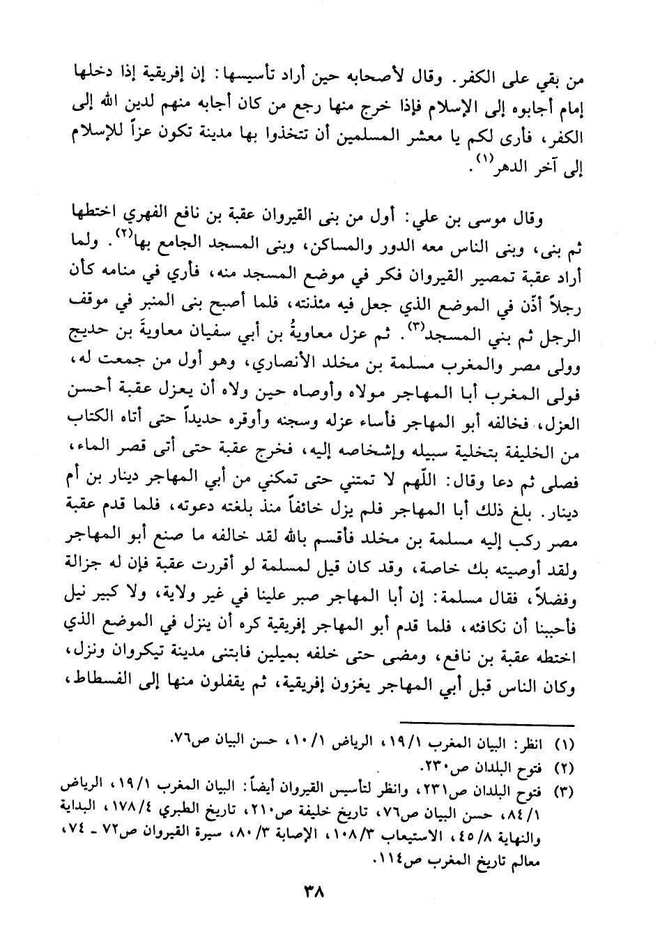 (¬3) فتوح البلدان 231 وانظر لتأسيس القيروان أيضا: البيان المغرب 1/ 19، الرياض 1/ 84، حسن البيان 76، تاريخ خليفة 210 تاريخ الطبري 4/ 178، البداية والنهاية 8/ 45، الاستيعاب 3/ 108، الإصابة 3/ 80، سيرة القيروان 72 - 74، معالم تاريخ المغرب 114.