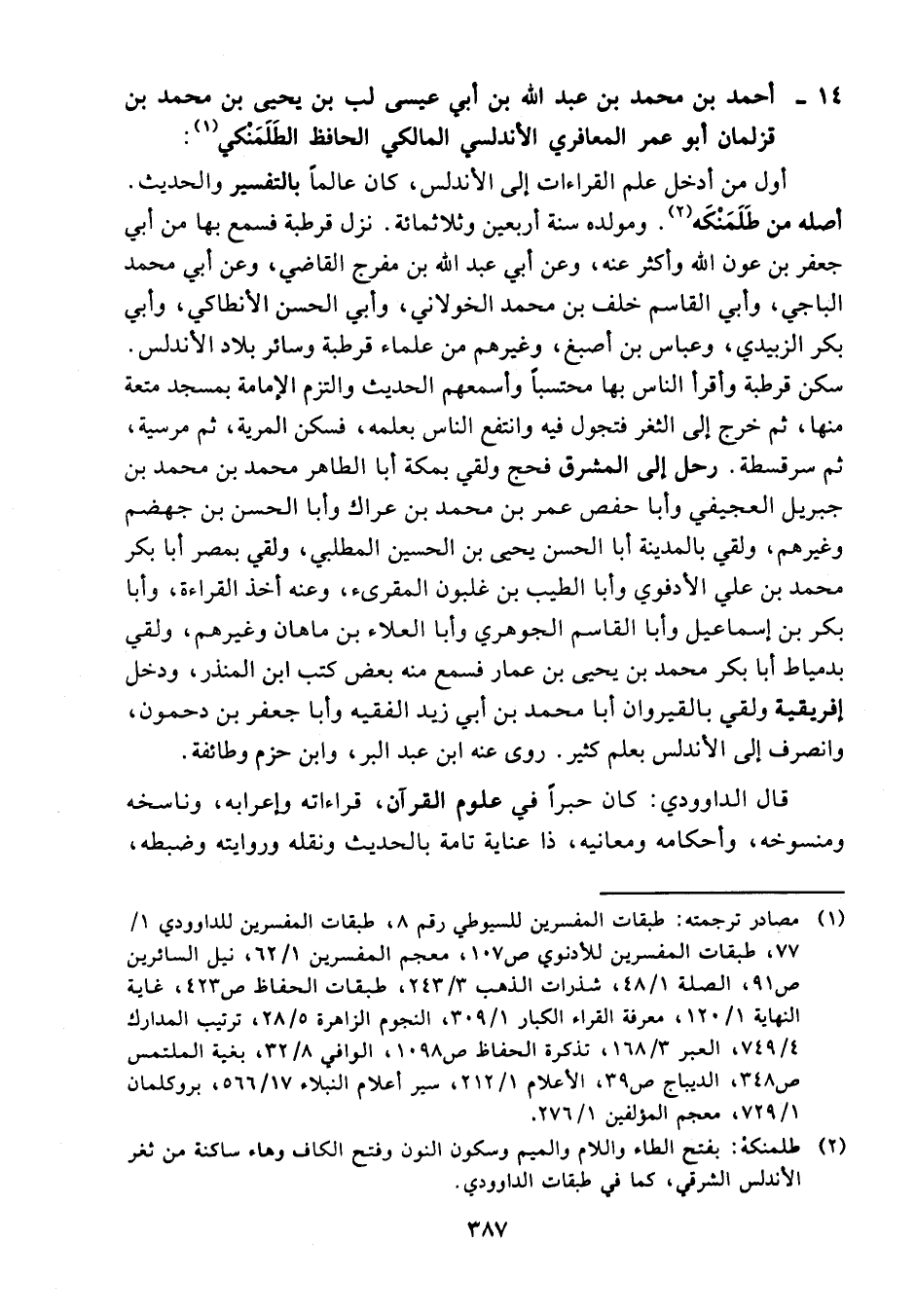 14 - أحمد بن محمد بن عبد الله بن أبي عيسى لب بن يحيى بن محمد بن قزلمان أبو عمر المعافري الأندلسي المالكي الحافظ الطلمنكي (¬1)
