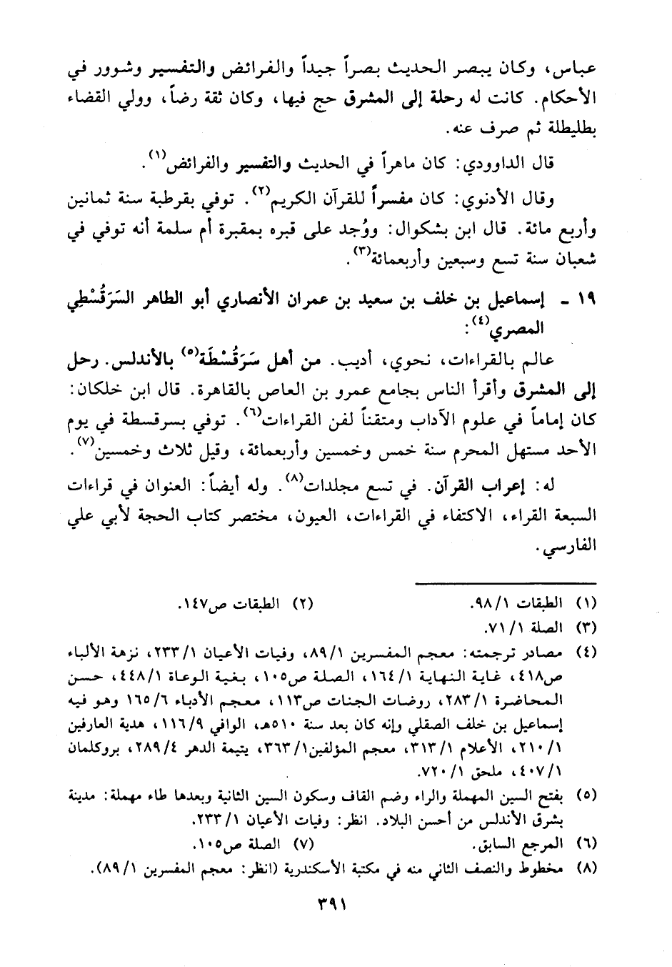 (¬4) مصادر ترجمته: معجم المفسرين 1/ 89، وفيات الأعيان 1/ 233، نزهة الألباء 418، غاية النهاية 1/ 164، الصلة 105، بغية الوعاة 1/ 448، حسن المحاضرة 1/ 283، روضات الجنات 113، معجم الأدباء 6/ 165 وهو فيه إسماعيل بن خلف الصقلي وإنه كان بعد سنة 510 هـ، الوافي 9/ 116، هدية العارفين 1/ 210، الأعلام 1/ 313، معجم المؤلفين1/ 363، يتيمة الدهر 4/ 289، بروكلمان 1/ 407، ملحق 1/ 720.