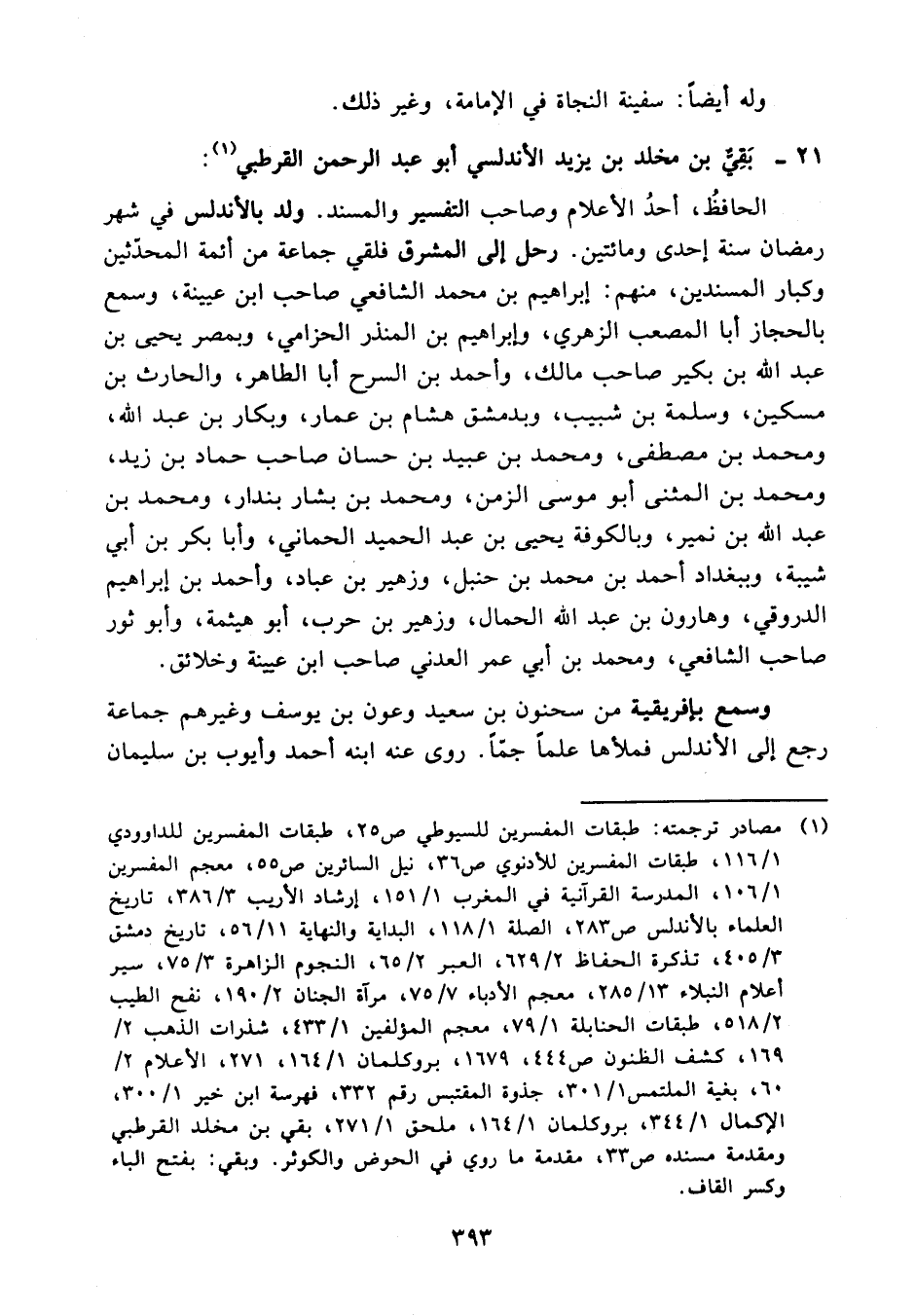 (¬1) مصادر ترجمته: طبقات المفسرين للسيوطي 25، طبقات المفسرين للداوودي 1/ 116، طبقات المفسرين للأدنوي ص: 36، نيل السائرين ص: 55، معجم المفسرين 1/ 106، المدرسة القرآنية في المغرب 1/ 151، إرشاد الأريب 3/ 386، تاريخ العلماء بالأندلس 283، الصلة 1/ 118، البداية والنهاية 11/ 56، تاريخ دمشق 3/ 405، تذكرة الحفاظ 2/ 629، العبر 2/ 65، النجوم الزاهرة 3/ 75، سير أعلام النبلاء 13/ 285، معجم الأدباء 7/ 75، مرآة الجنان 2/ 190، نفح الطيب 2/ 518، طبقات الحنابلة 1/ 79، معجم المؤلفين 1/ 433، شذرات الذهب 2/ 169، كشف الظنون 444، 1679، بروكلمان 1/ 164، 1/ 271، الأعلام 2/ 60، بغية الملتمس1/ 301، جذوة المقتبس رقم 332، فهرسة ابن خير 1/ 300، الإكمال 1/ 344، بروكلمان 1/ 164، ملحق 1/ 271، بقي بن مخلد القرطبي ومقدمة مسنده ص: 33، مقدمة ماروي في الحوض والكوثر.