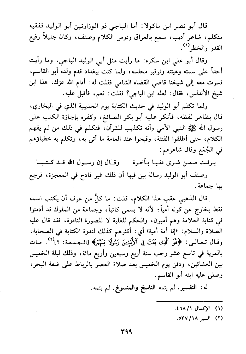 قال أبو نصر ابن ماكولا: أما الباجي ذو الوزارتين أبو الوليد ففقيه متكلم، شاعر أديب سمع بالعراق ودرس الكلام وصنف، وكان جليلاً رفيع القدر والخطر (¬1).