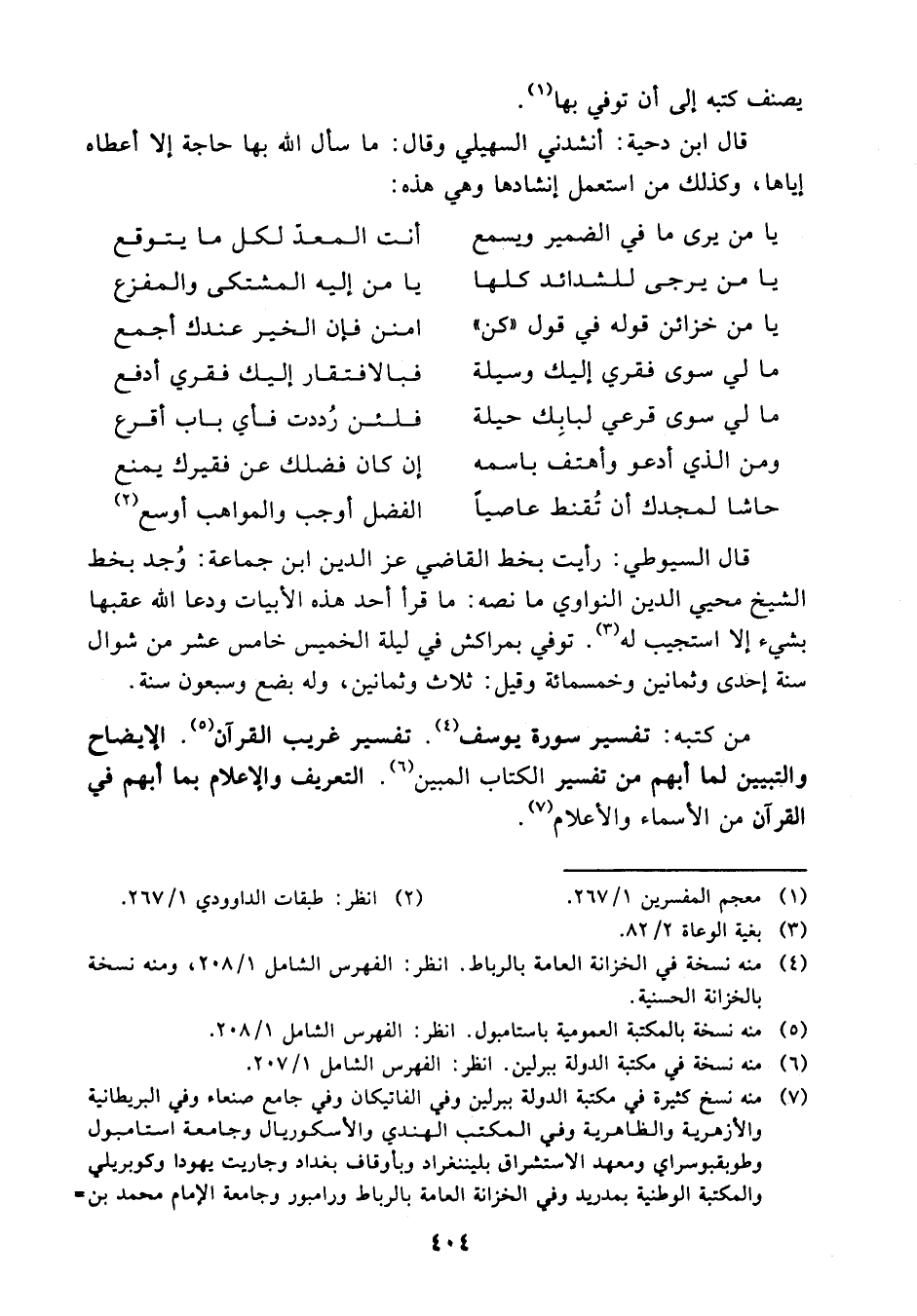 (¬7) منه نسخ كثيرة في مكتبة الدولة ببرلين وفي الفاتيكان وفي جامع صنعاء وفي البريطانية والأزهرية والظاهرية وفي المكتب الهندي والأسكوريال وجامعة استامبول وطوبقبوسراي ومعهد الاستشراق بليننغراد وبأوقاف بغداد وجاريت يهودا وكوبريلي والمكتبة الوطنية بمدريد وفي الخزانة العامة بالرباط ورامبور وجامعة الإمام محمد بن سعود بالرياض ومكتبة أسعد أفندي وفي بلدية الإسكندرية والتيمورية وامبروزيانا وبودليانا وجامعة ليدن وفي المكتبة الحسنية والمكتبة العامة بالرباط ومكتبة حسن حسني ومحمد مراد ودار الكتب المصرية ومكتبة الدولة بميونيخ ومكتبة شهيد عي باشا وعاشر أفندي وعبد المجيد مولوي والعمومية ولا له لي والمتحف الآسيوي بالقوقاز ومكتبة ولي الدين. وقد وضع عليه البلنسي ت 782 هـ حاشية، واختصره بحرق الحضرمي، وزاد عليه مؤلف مجهول زيادات. انظر بروكلمان ملحق 1/ 734، الفهرس الشامل 1/ 207 وعليه كتابان هما التكميل والإتمام لكتاب التعريف والإعلام لمحمد بن علي بن خضر بن هارون ابن عسكر الغساني المتوفى 636 هـ، وكتاب الاستدراك والإتمام للتعريف والإعلام لأحمد بن يوسف بن فرتون السلمي المتوفى 660 هـ.