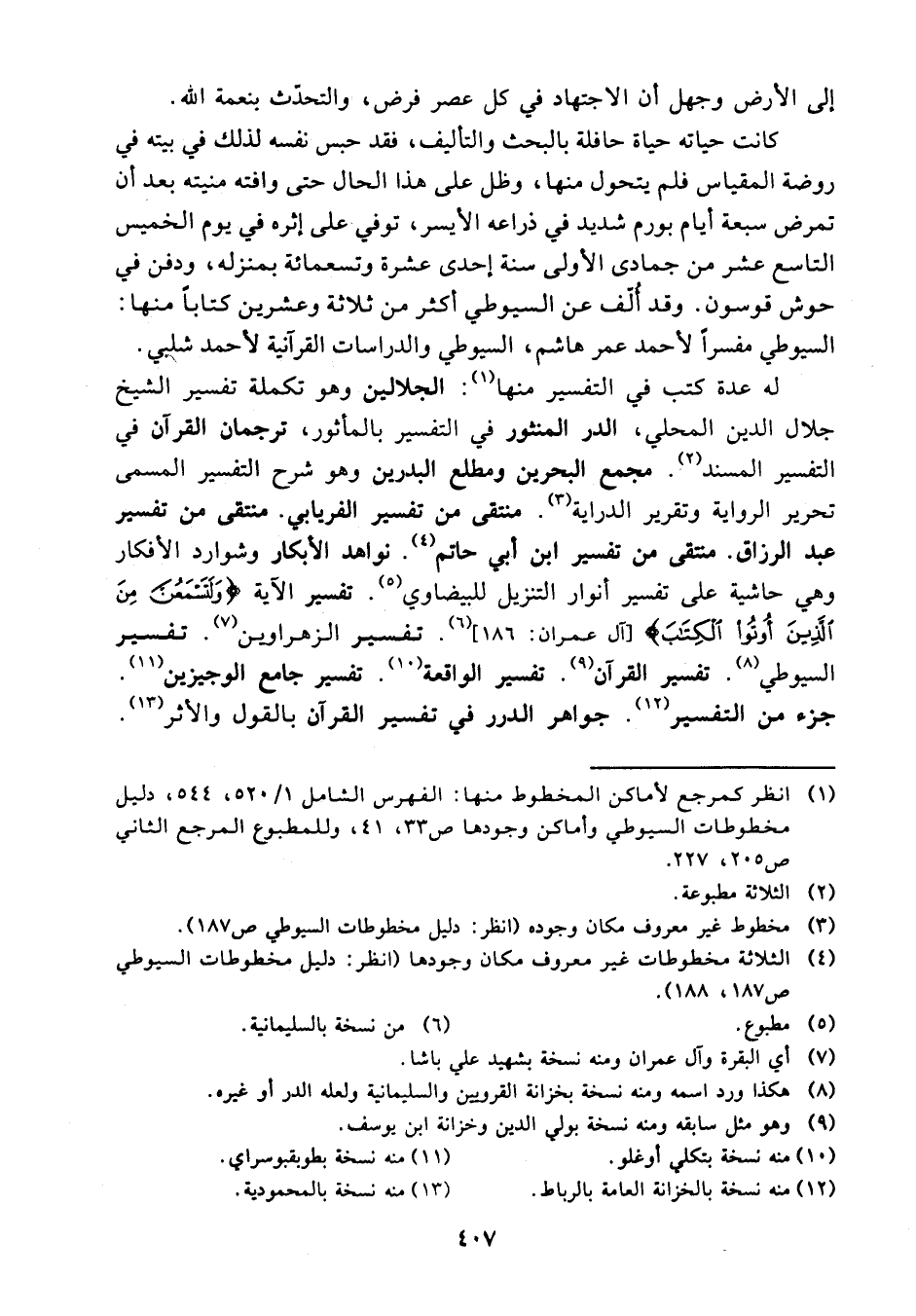 (¬1) انظر كمرجع لأماكن المخطوط منها الفهرس الشامل 1/ 520 - 544، دليل مخطوطات السيوطي وأماكن وجودها ص: 33 - 41، وللمطبوع المرجع الثاني ص: 205 - 227.