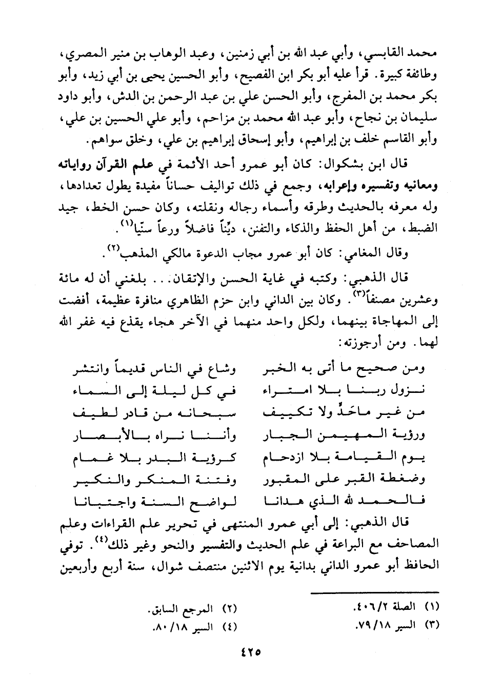 قال الذهبي: إلى أبي عمرو المنتهى في تحرير علم القراءات وعلم المصاحف مع البراعة في علم الحديث والتفسير والنحو وغير ذلك. (¬4)