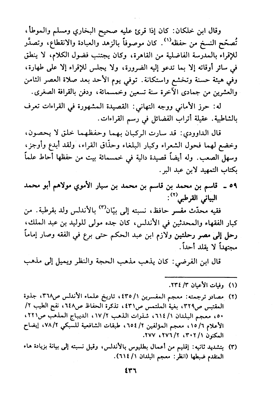 (¬2) مصادر ترجمته: معجم المفسرين 1/ 435، تاريخ علماء الأندلس 368، جذوة المقتبس 329، بغية الملتمس 431، تذكرة الحفاظ 648، نفح الطيب 2/ 50، معجم البلدان 1/ 614، شذرات الذهب 2/ 17، الديباج المذهب 221، الأعلام 6/ 15، معجم المؤلفين 2/ 654، طبقات الشافعية للسبكي 2/ 78، إيضاح المكنون 1/ 302، 2/ 276، 277.
