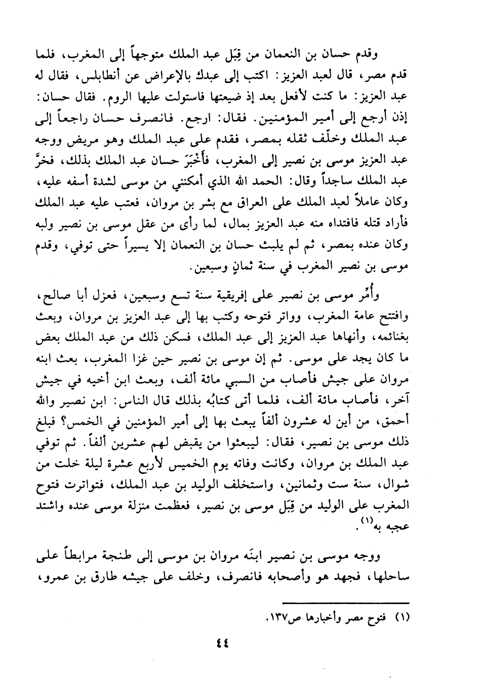 وقدم حسان بن النعمان من قبل عبد الملك متوجها إلى المغرب، فلما قدم مصر، قال لعبد العزيز: اكتب إلى عبدك بالإعراض عن أنطابلس فقال له عبد العزيز: ماكنت لأفعل بعد إذ ضيعتها فاستولت عليها الروم. فقال حسان: إذن أرجع إلى أمير المؤمنين فقال: ارجع. فانصرف حسان راجعا إلى عبد الملك وخلف ثقله بمصر فقدم على عبد الملك وهو مريض ووجه عبد العزيز موسى بن نصير إلى المغرب، فأخبر حسان عبد الملك بذلك فخر عبد الملك ساجدا وقال: الحمد لله الذي أمكنني من موسى لشدة أسفه عليه، وكان عاملا لعبد الملك على العراق مع بشر بن مروان فعتب عليه عبد الملك فأراد قتله فافتداه منه عبد العزيز بمال لما رأى من عقل موسى بن نصير ولبه وكان عنده بمصر، ثم لم يلبث حسان بن النعمان إلايسيرا حتى توفي، وقدم موسى بن نصير المغرب في سنة ثمان وسبعين.