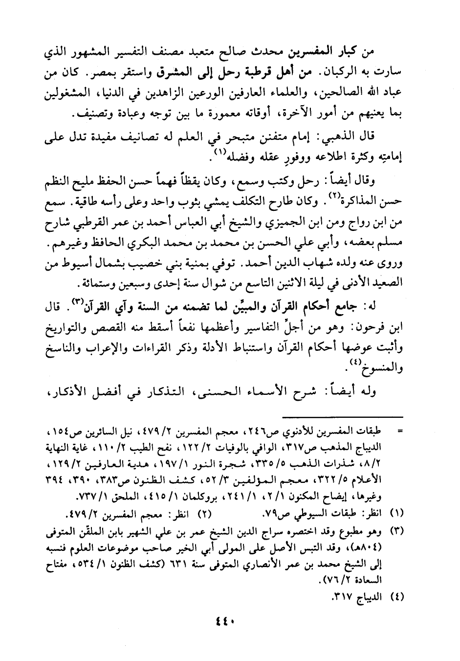 قال ابن فرحون: وهو من أجل التفاسير وأعظمها نفعا أسقط منه القصص والتواريخ وأثبت عوضها أحكام القرآن واستنباط الأدلة وذكر القراءات والإعراب والناسخ والمنسوخ. (¬4)