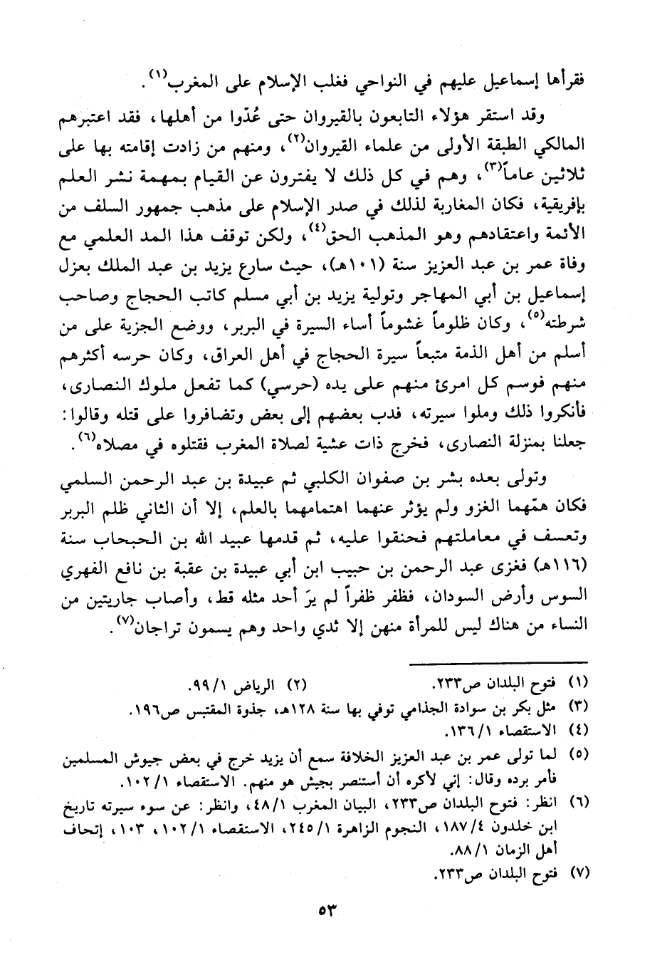 (¬6) انظر فتوح البلدان ص: 233، البيان المغرب 1/ 48، وانظر عن سوء سيرته تاريخ ابن خلدون 4/ 187، النجوم الزاهرة 1/ 245، الاستقصا 1/ 102، 103، إتحاف أهل الزمان 1/ 88.