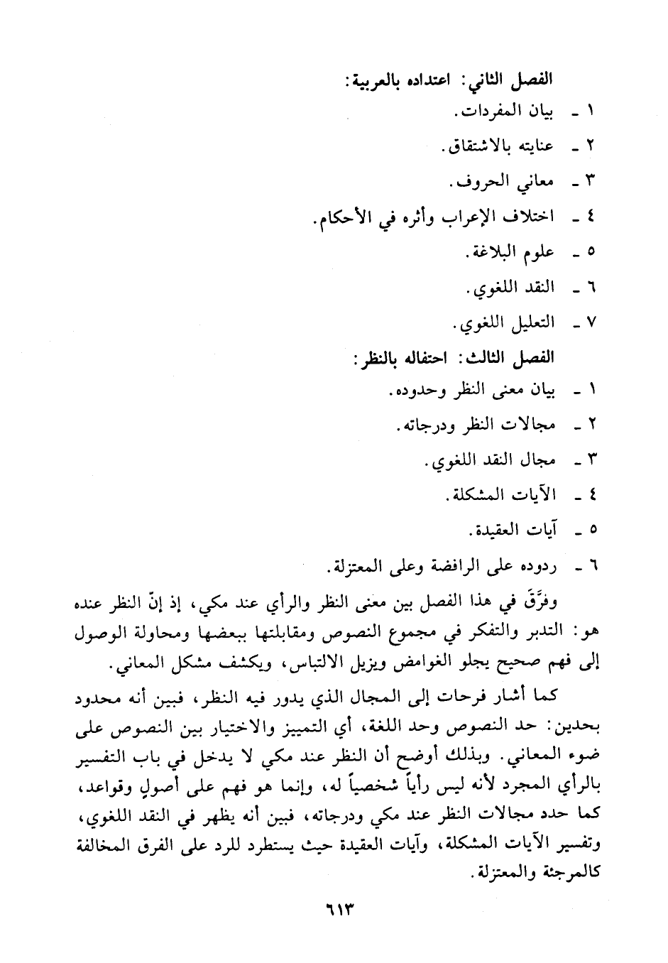 وبذلك أوضح أن النظر عند مكي لا يدخل في باب التفسير بالرأي المجرد لأنه ليس رأيا شخصيا له وإنما هو فهم على أصول وقواعد، كما حدد مجالات النظر عند مكي ودرجاته، فبين أنه يظهر في النقد اللغوي، وتفسير الآيات المشكلة، وآيات العقيدة حيث يستطرد للرد على الفرق المخالفة كالمرجئة والمعتزلة.