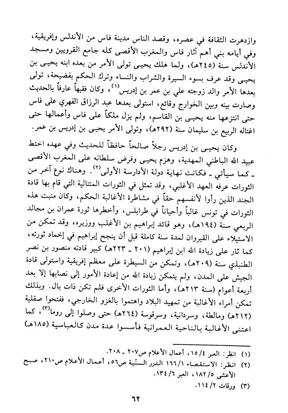 ولما هلك يحيى تولى الأمر من بعده ابنه يحيى بن يحيى وقد عرف بسوء السيرة والشراب والنساء وترك الحكم بفضيحة، تولى بعدها الأمر والد زوجته علي بن عمر بن إدريس (¬1) وكان فقيها عارفا بالحديث وصارت بينه وبين الخوارج وقائع، استولى بعدها عبد الرزاق الفهري على فاس حتى انتزعها منه يحيى بن القاسم، ولم يزل ملكا على فاس وأعمالها حتى اغتاله الربيع بن سليمان سنة 292 هـ، وتولى الأمر يحيى بن إدريس بن عمر.