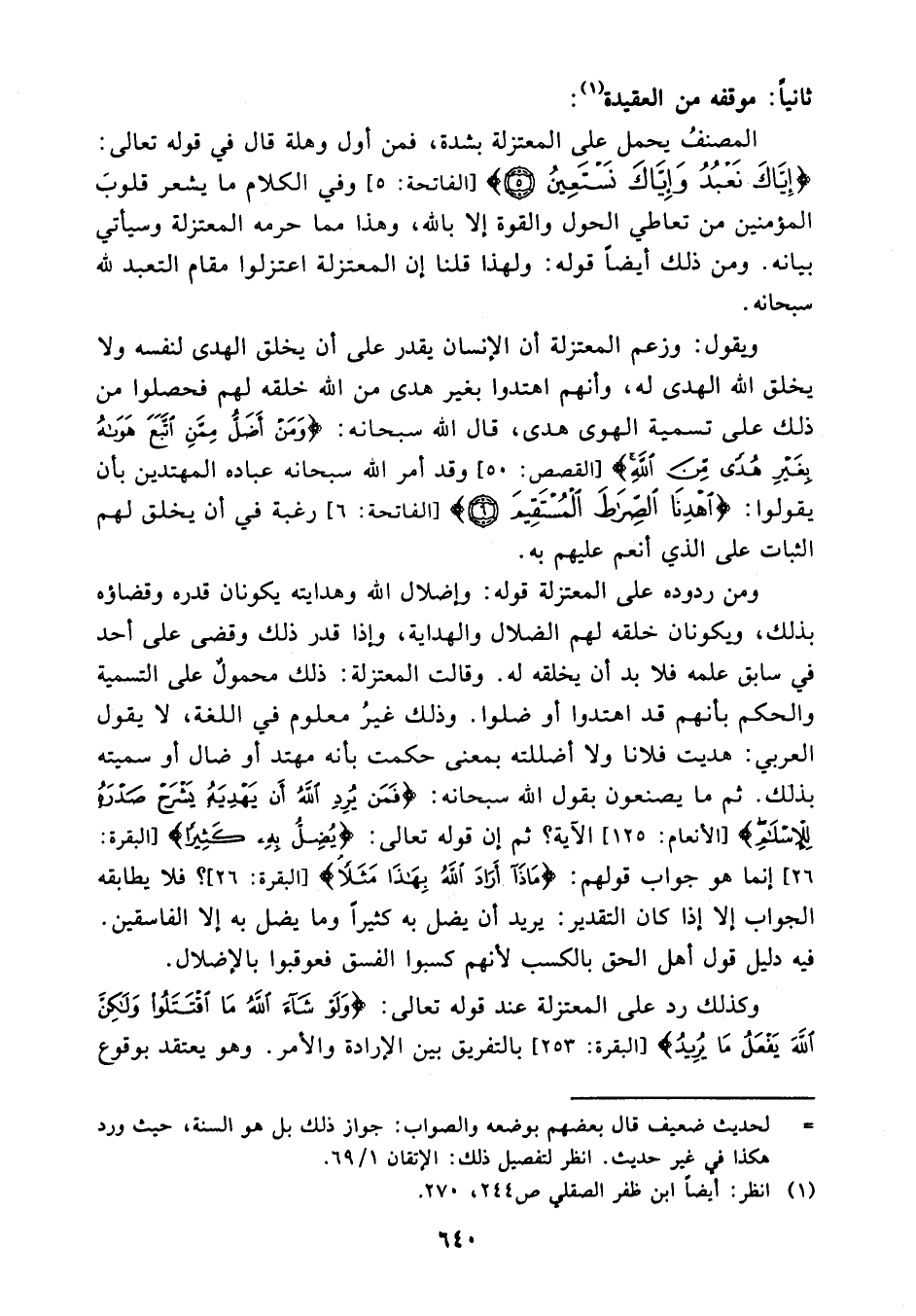 المصنف يحمل على المعتزلة بشدة فمن أول وهلة قال في قوله تعالى {إياك نعبد وإياك نستعين} (¬2):