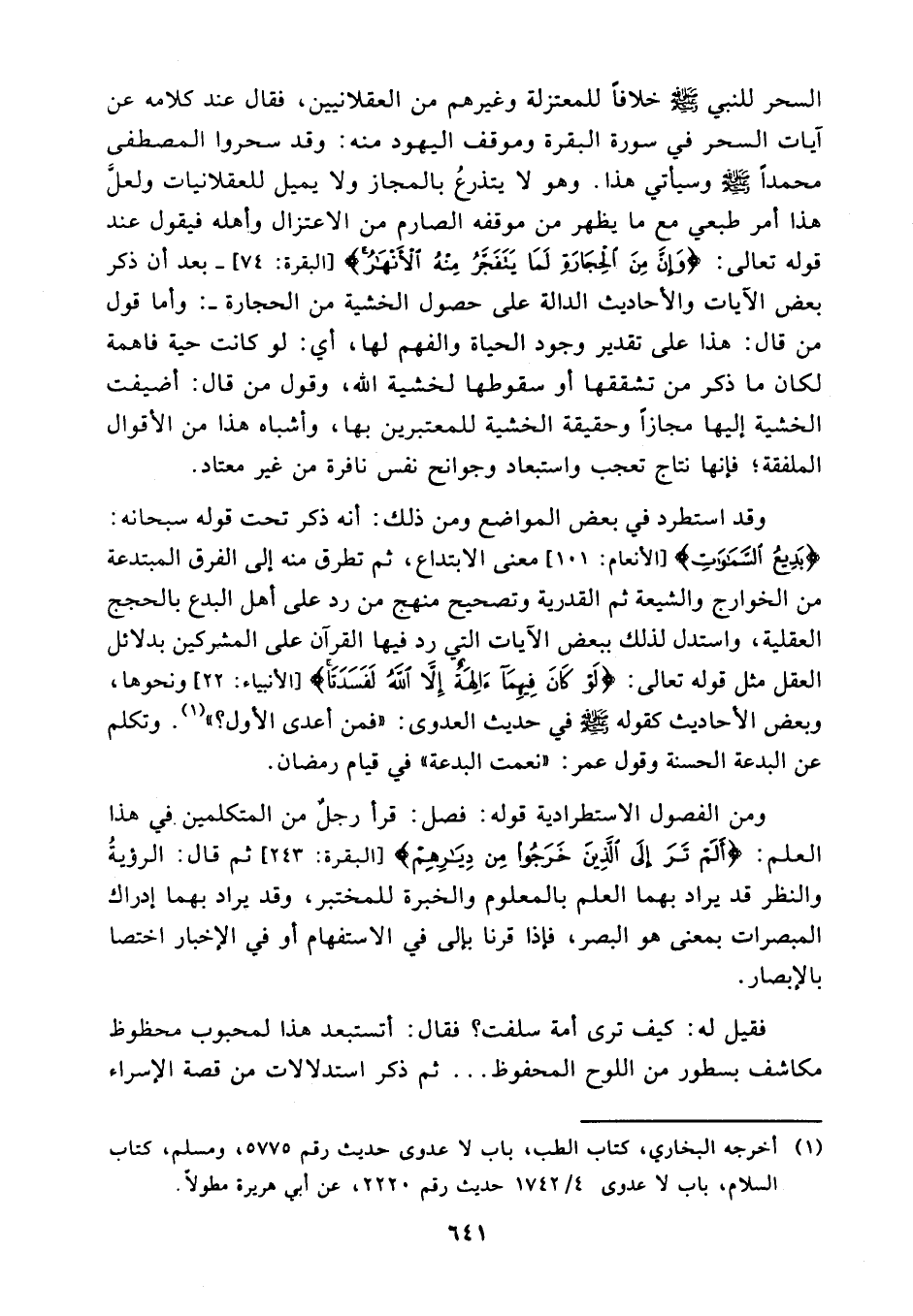 أنه ذكر تحت قوله سبحانه {بديع السموات} (¬2) معنى الابتداع ثم تطرق منه إلى الفرق المبتدعة من الخوارج والشيعة ثم القدرية وتصحيح منهج من رد على أهل البدع بالحجج العقلية واستدل لذلك ببعض الآيات التي رد فيها القرآن على المشركين بدلائل العقل مثل قوله تعالى {لو كان فيهما آلهة إلا الله لفسدتا} (¬3) ونحوها، وبعض الأحاديث كقوله - صلى الله عليه وسلم - في حديث العدوى: "فمن أعدى الأول؟ " (¬4). وتكلم عن البدعة الحسنة وقول عمر: "نعمت البدعة". في قيام رمضان.