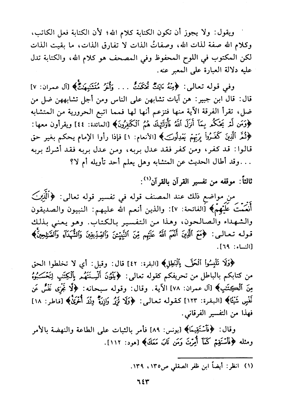 ويقول: ولا يجوز أن تكون الكتابة كلام الله لأن الكتابة فعل الكاتب وكلام الله صفة لذات الله وصفات الذات لا تفارق الذات ما بقيت الذات لكن المكتوب في اللوح المحفوظ وفي المصحف هو كلام الله والكتابة تدل عليه دلالة العبارة على المعبر عنه.