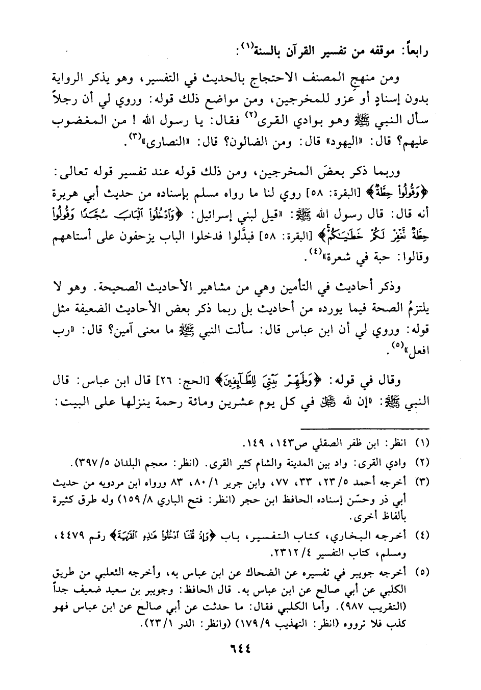 ومن منهج المصنف الاحتجاج بالحديث في التفسير وهو يذكر الرواية بدون إسناد أو عزو للمخرجين ومن مواضع ذلك قوله: وروي لي أن رجلا سأل النبي - صلى الله عليه وسلم - وهو بوادي القرى (¬2) فقال: يا رسول الله! من المغضوب عليهم؟ قال: "اليهود" قال: ومن الضالون؟ قال: "النصارى" (¬3).