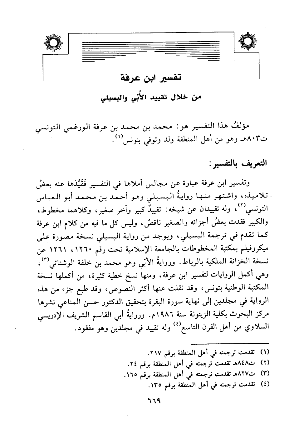 وتفسير ابن عرفة عبارة عن مجالس أملاها في التفسير فقيدها عنه بعض تلاميذه واشتهر منها رواية البسيلي وهو أحمد بن محمد أبو العباس التونسي (¬2) وله تقييدان عن شيخه تقييد كبير وآخر صغير وكلاهما مخطوط والكبير فقدت بعض أجزائه والصغير ناقص، وليس كل مافيه من كلام ابن عرفة كما تقدم في ترجمة البسيلي ويوجد من رواية البسيلي نسخة مصورة على ميكروفيلم بمكتبة المخطوطات بالجامعة الإسلامية تحت رقم 1260، 1261 عن نسخة الخزانة الملكية بالرباط، ورواية الأبي وهو محمد بن خلفة الوشتاتي (¬3) وهي أكمل الروايات لتفسير ابن عرفة ومنها نسخ خطية كثيرة من أكملها نسخة المكتبة الوطنية بتونس وقد نقلت عنها أكثر النصوص، وقد طبع جزء من هذه الرواية في مجلدين إلى نهاية سورة البقرة بتحقيق الدكتور حسن المناعي نشرها مركز البحوث بكلية الزيتونة سنة 1986 م، ورواية أبي القاسم الشريف الإدريسي السلاوي من أهل القرن التاسع (¬4) وله تقييد في مجلدين وهو مفقود.