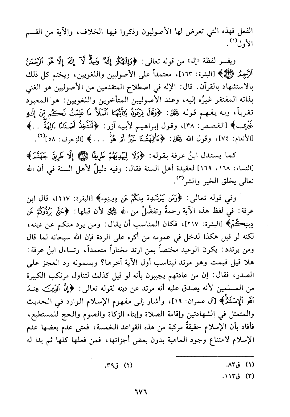 ويفسر لفظة "إله" من قوله تعالى {وإلهكم إله واحد لاإله إلا هو الرحمن الرحيم} (¬2)، معتمدا على الأصوليين واللغويين، ويختم كل ذلك بالاستشهاد بالقرآن. قال: الإله في اصطلاح المتقدمين من الأصوليين هو الغني بذاته المفتقر غيره إليه، وعند الأصوليين المتأخرين واللغويين: هو المعبود تقربا، وبه يفهم قوله عز وجل {وقال فرعون يا أيها الملأ ماعلمت لكم من إله غيري} (¬3)، وقول إبراهيم لأبيه آزر {أتتخذ أصنامًا آلهة ..} (¬4)، وقول الله عز وجل {ءآلهتنا خير أم هو ...} (¬5) (¬6).