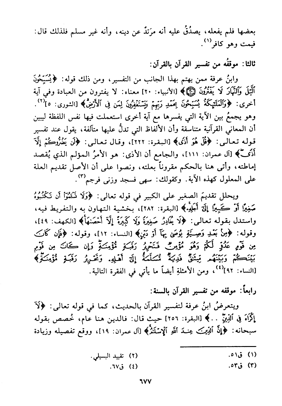 وابن عرفة ممن يهتم بهذا الجانب من التفسير ومن ذلك قوله: {يسبحون الليل والنهار لايفترون} (¬2) معناه: لايفترون من العبادة وفي آية أخرى {والملائكة يسبحون بحمد ربهم ويستغفرون لمن في الأرض} (¬3) (¬4)
