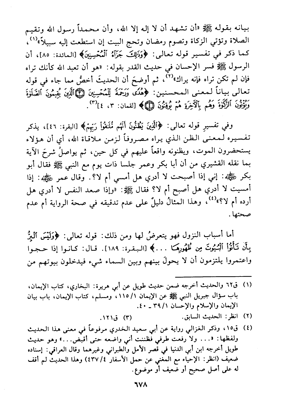 كما ذكر في تفسير قوله تعالى: {وذلك جزاء المحسنين} (¬2)، أن الرسول - صلى الله عليه وسلم - فسر الإحسان في حديث القدر بقوله: "هو أن تعبد الله كأنك تراه فإن لم تكن تراه فإنه يراك" (¬3) ثم أوضح أن الحديث أخص مما جاء في قوله تعالى بيانًا لمعنى المحسنين {هدىً ورحمة للمحسنين، الذين يقيمون الصلاة ويؤتون الزكاة وهم بالآخرة هم يوقنون} (¬4). (¬5)