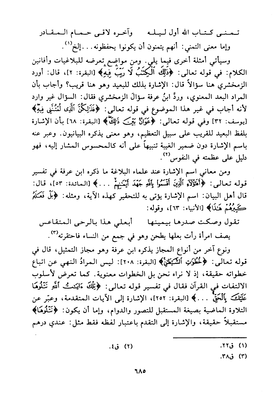 في قوله تعالى {ذلك الكتاب لا ريب فيه} (¬2)، قال: أورد الزمخشري هنا سؤالاً قال: الإشارة بذلك للبعيد وهو هنا قريب؟ وأجاب بأن المراد البعد المعنوي ورد ابن عرفة سؤال الزمخشري فقال: السؤال غير وارد لأنه أجاب في غير هذا الموضوع في قوله تعالى {فذلكن الذي لمتنني فيه} (¬3) وفي قوله تعالى {عوان بين ذلك} (¬4) بأن الإشارة بلفظ البعيد للقريب على سبيل التعظيم، وهو معنى يذكرة البيانيون. وعبر عنه باسم الإشارة دون ضمير الغيبة تنبيها على أنه كالمحسوس المشار إليه، فهو دليل على عظمته في النفوس. (¬5)