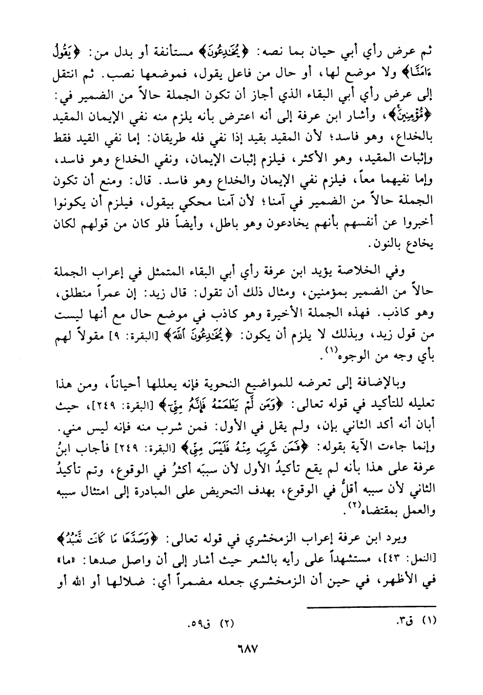 وفي الخلاصة يؤيد ابن عرفة رأي أبي البقاء المتمثل في إعراب الجملة حالا من الضمير بمؤمنين، ومثال ذلك أن تقول: قال زيد: إن عمرا منطلق، وهو كاذب. فهذه الجملة الأخيرة وهو كاذب في موضع حال مع أنها ليست من قول زيد، وبذلك لايلزم أن يكون {يخادعون الله} (¬1) مقولا لهم بأي وجه من الوجوه. (¬2)