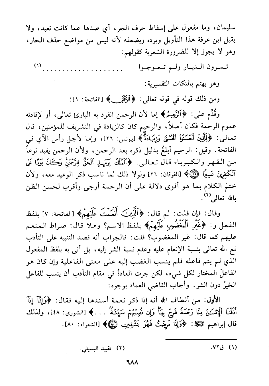 وقال: فإن قلت: لم قال {الذين أنعمت عليهم} (¬6) بلفظ الفعل و {غير المغضوب عليهم} بلفظ الاسم؟ وهلا قال: صراط المنعم عليهم كما قال: غير المغضوب؟ قلت: فالجواب أنه قصد التنبيه على التأدب مع الله تعالى بنسبة الإنعام عليه وعدم نسبة الشر إليه بل أتى به بلفظ المفعول الذي لم يتم فاعله فلم ينسب الغضب إليه على معنى الفاعلية وإن كان هو الفاعل المختار لكل شيء لكن جرت العادة في مقام التأدب أن ينسب للفاعل الخير دون الشر.