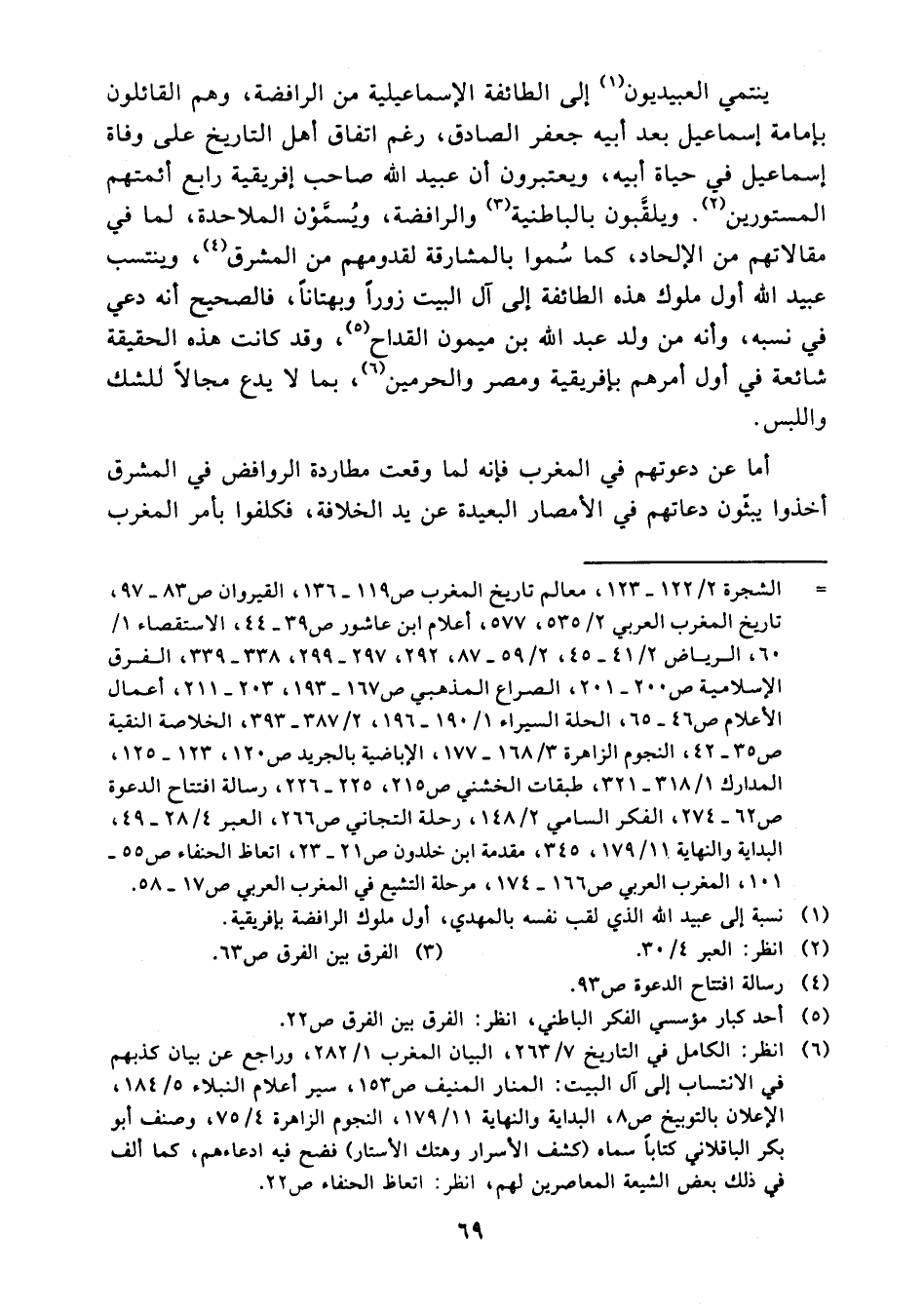 (¬6) انظر: الكامل في التاريخ 7/ 263، البيان المغرب 1/ 282، وراجع عن بيان كذبهم في الانتساب إلى آل البيت: المنار المنيف 153، سير أعلام النبلاء 5/ 184، الإعلان بالتوبيخ 8، البداية والنهاية 11/ 179، النجوم الزاهرة 4/ 75، وصنف أبو بكر الباقلاني كتابا سماه (كشف الأسرار وهتك الأستار) فضح فيه ادعاءهم، كما ألف في ذلك بعض الشيعة المعاصرين لهم، انظر اتعاظ الحنفاء 22.
