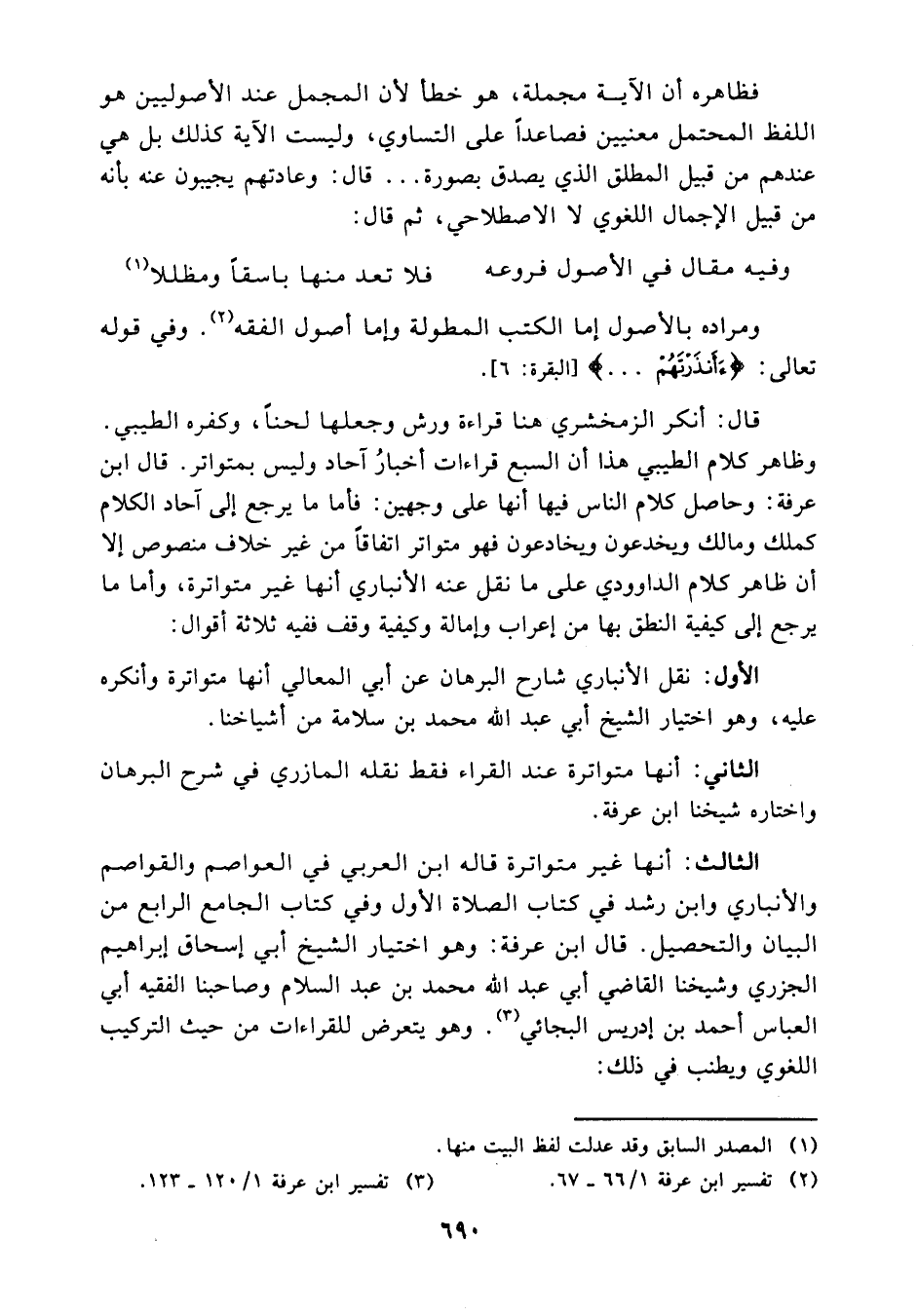 الثالث: أنها غير متواترة قاله ابن العربي في العواصم والقواصم والأنباري وابن رشد في كتاب الصلاة الأول وفي كتاب الجامع الرابع من البيان والتحصيل قال ابن عرفة: وهو اختيار الشيخ أبي إسحاق إبراهيم الجزري وشيخنا القاضي أبي عبد الله محمد بن عبد السلام وصاحبنا الفقيه أبي العباس أحمد بن إدريس البجائي. (¬4)