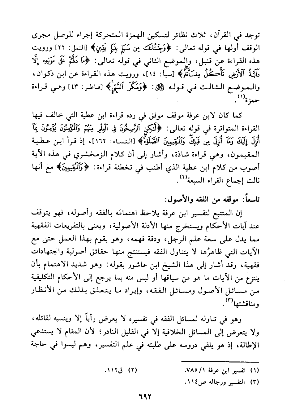 كما كان لابن عرفة موقف موفق في رده قراءة ابن عطية التي خالف فيها القراءة المتواترة في قوله تعالى {لكن الراسخون في العلم منهم والمؤمنون يؤمنون بما أنزل إليك وما أنزل من قبلك والمقيمين الصلاة} (¬5)، إذ قرأ ابن عطية المقيمون، وهي قراءة شاذة، وأشار إلى أن كلام الزمخشري في هذه الآية أصوب من كلام ابن عطية الذي أطنب في تخطئه قراءة {المقيمين} مع أنها نالت إجماع القراء السبعة. (¬6)