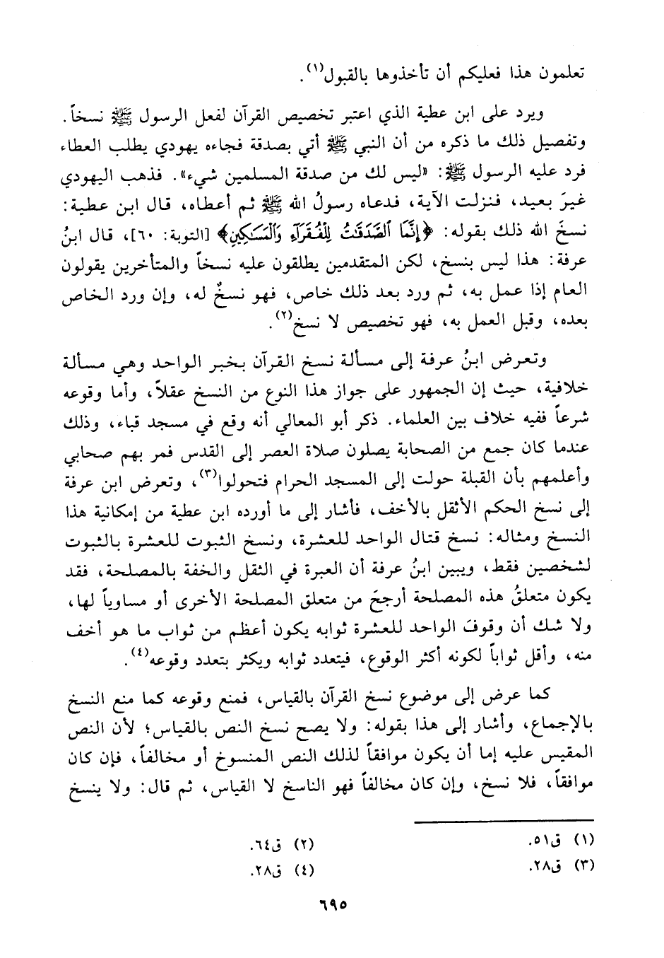 وتعرض ابن عرفة إلى مسألة نسخ القرآن بخبر الواحد وهي مسالة خلافية، حيث إن الجمهور على جواز هذا النوع من النسخ عقلا، وأما وقوعه شرعًا ففيه خلاف بين العلماء. ذكر أبو المعالي أنه وقع في مسجد قباء، وذلك عندما كان جمع من الصحابة يصلون صلاة العصر إلى القدس فمر بهم صحابي وأعلمهم بأن القبلة حولت إلى المسجد الحرام فتحولوا. (¬4)