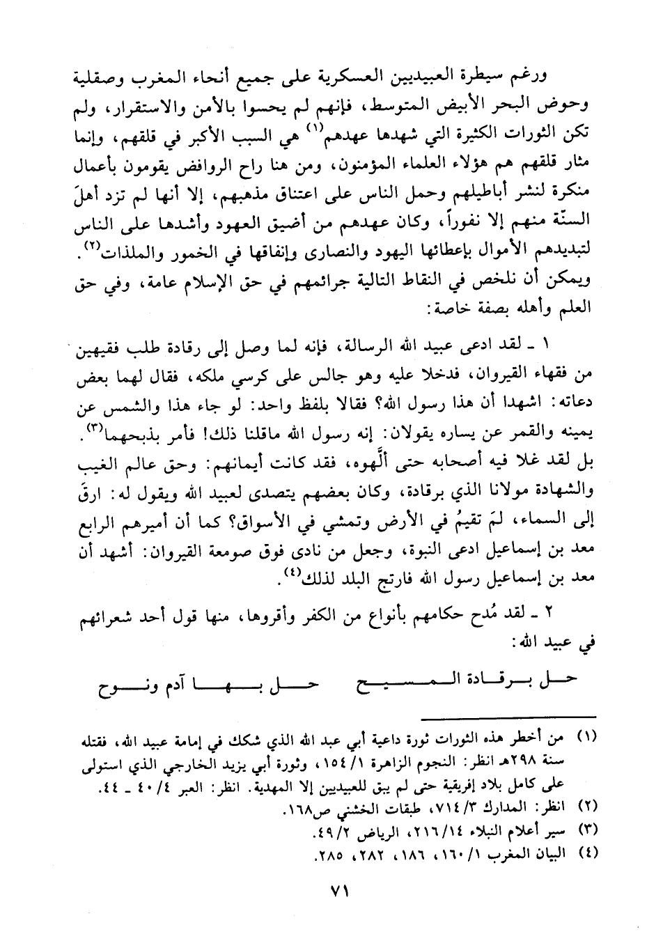 (¬1) من أخطر هذه الثورات ثورة داعية أبي عبد الله الذي شكك في إمامة عبيد الله، فقتله سنة 298 هـ انظر النجوم الزاهرة 1/ 154، وثورة أبي يزيد الخارجي الذي استولى على كامل بلاد إفريقية حتى لم يبق للعبيديين إلا المهدية انظر العبر 4/ 40 - 44.
